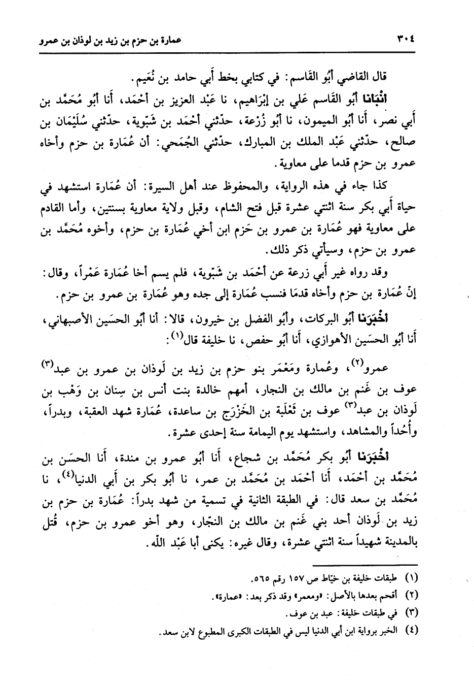 قال القاضي أبو القاسم في كتابي بخط أبي حامد بن نعيم أنبأنا أبو القاسم علي بن إبراهيم نا عبد العزيز بن أحمد أنا أبو محمد بن أبي نصر أنا أبو الميمون نا أبو زرعة حدثني أحمد بن شبوية حدثني سليمان بن صالح حدثني عبد الملك بن المبارك حدثني الجمحي أن عمارة بن حزم وأخاه عمرو بن حزم قدما على معاوية كذا جاء في هذه الرواية والمحفوظ عند أهل السيرة أن عمارة استشهد في حياة أبي بكر سنة اثنتي عشرة قبل فتح الشام وقبل ولاية معاوية بسنتين وأما القادم على معاوية فهو عمارة بن عمرو بن حزم ابن أخي عمارة بن حزم وأخوه محمد بن عمرو بن حزم وسيأتي ذكر ذلك وقد رواه غير أبي زرعة عن أحمد بن شبوية فلم يسم أخا عمارة عمرا وقال إن عمارة بن حزم وأخاه قدما فنسب عمارة إلى جده وهو عمارة بن عمرو بن حزم أخبرنا أبو البركات وأبو الفضل بن خيرون قالا أنا أبو الحسين الأصبهاني أنا أبو الحسين الأهوازي أنا أبو حفص نا خليفة قال (1) عمرو (2) وعمارة ومعمر بنو حزم بن زيد بن لوذان بن عمرو بن عبد (3) عوف بن غنم بن مالك بن النجار أمهم خالدة بنت أنس بن سنان بن وهب بن لوذان بن عبد عوف بن ثعلبة بن الخزرج بن ساعدة عمارة شهد العقبة وبدرا وأحدا والمشاهد واستشهد يوم اليمامة سنة إحدى عشرة أخبرنا أبو بكر محمد بن شجاع أنا أبو عمرو بن مندة أنا الحسن بن محمد بن أحمد أنا أحمد بن محمد بن عمر نا أبو بكر بن أبي الدنيا (4) نا محمد بن سعد قال في الطبقة الثانية في تسمية من شهد بدرا عمارة بن حزم بن زيد بن لوذان أحد بني غنم بن مالك بن النجار وهو أخو عمرو بن حزم قتل بالمدينة شهيدا سنة اثنتي عشرة وقال غيره يكنى أبا عبد الله