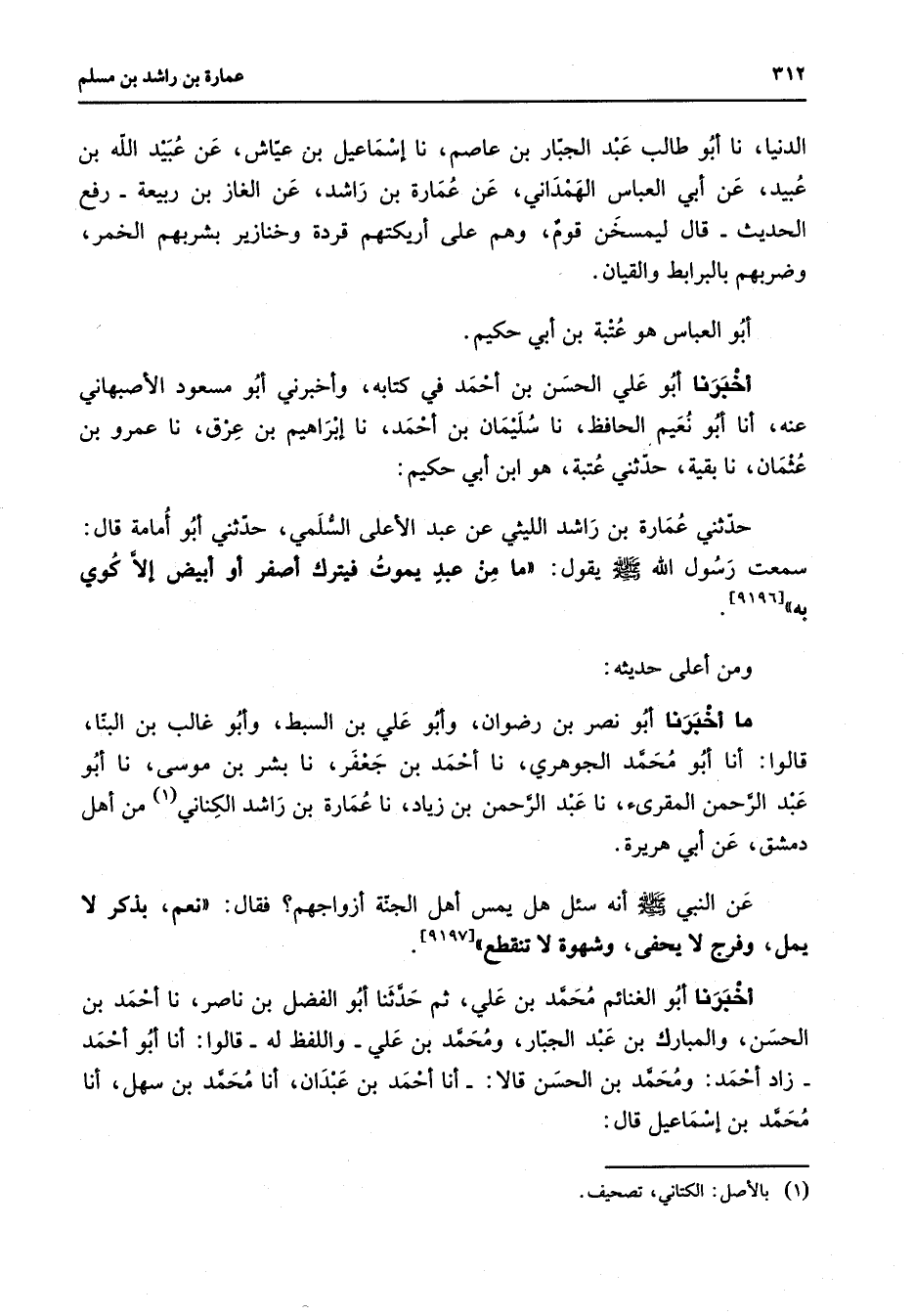 [9196] ومن أعلى حديثه ما أخبرنا أبو نصر بن رضوان وأبو علي بن السبط وأبو غالب بن البنا قالوا أنا أبو محمد الجوهري نا أحمد بن جعفر نا بشر بن موسى نا أبو عبد الرحمن المقرئ نا عبد الرحمن بن زياد نا عمارة بن راشد الكناني (1) من أهل دمشق عن أبي هريرة عن النبي (صلى الله عليه وسلم) أنه سئل هل يمس أهل الجنة أزواجهم فقال نعم بذكر لا يمل وفرج لا يحفى وشهوة لا تنقطع