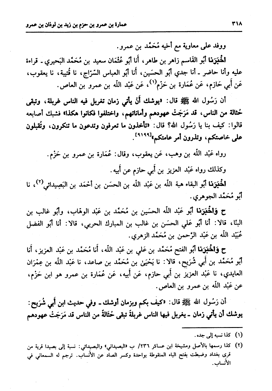 ووفد على معاوية مع أخيه محمد بن عمرو أخبرنا أبو القاسم زاهر بن طاهر أنا أبو عثمان سعيد بن محمد البحيري قراءة عليه وأنا حاضر أنا جدي أبو الحسين أنا أبو العباس السراج نا قتيبة نا يعقوب عن أبي حازم عن عمارة بن حزم (1) عن عبد الله بن عمرو بن العاص أن رسول الله (صلى الله عليه وسلم) قال يوشك أن يأتي زمان تغربل فيه الناس غربلة وتبقى حثالة من الناس قد مرجت عهودهم وأماناتهم واختلفوا فكانوا هكذا فشبك أصابعه قالوا كيف بنا يا رسول الله قال تأخذون ما تعرفون وتدعون ما تنكرون وتقبلون على خاصتكم وتذرون أمر عامتكم