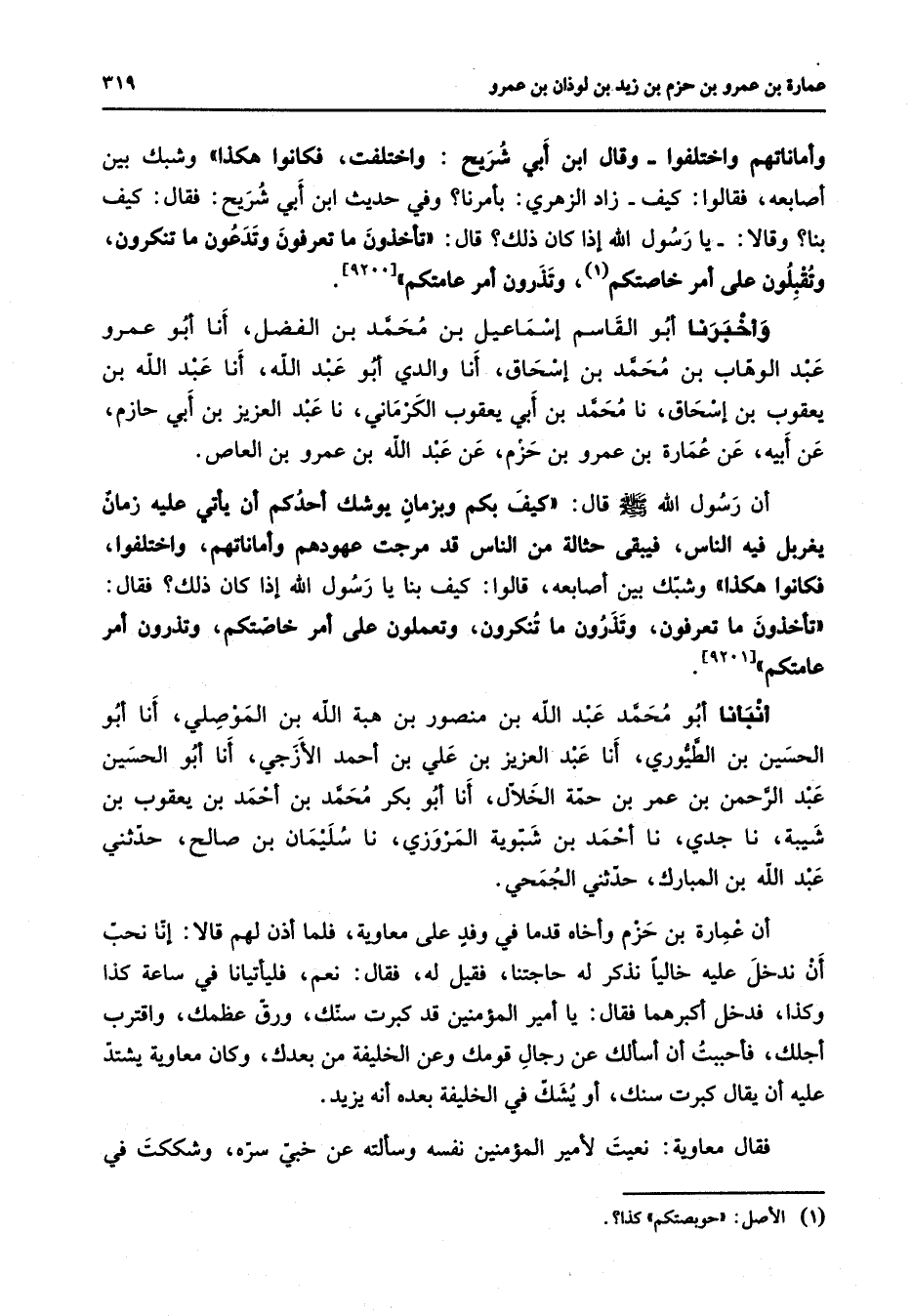 [9201] أنبأنا أبو محمد عبد الله بن منصور بن هبة الله بن الموصلي أنا أبو الحسين بن الطيوري أنا عبد العزيز بن علي بن أحمد الأزجي أنا أبو الحسين عبد الرحمن بن عمر بن حمة الخلال أنا أبو بكر محمد بن أحمد بن يعقوب بن شيبة نا جدي نا أحمد بن شبوية المروزي نا سليمان بن صالح حدثني عبد الله بن المبارك حدثني الجمحي أن عمارة بن حزم وأخاه قدما في وفد على معاوية فلما أذن لهم قالا إنا نحب أن ندخل عليه لعليه خاليا نذكر له حاجتنا فقيل له فقال نعم فليأتينا في ساعة كذا وكذا فدخل أكبرهما فقال يا أمير المؤمنين قد كبرت سنك ورق عظمك واقترب أجلك فأحببت أن أسألك عن رجال قومك وعن الخليفة من بعدك وكان معاوية يشتد عليه أن يقال كبرت سنك أو يشك في الخليفة بعده أنه يزيد فقال معاوية نعيت لأمير المؤمنين نفسه وسألته عن خبي سره وشككت في