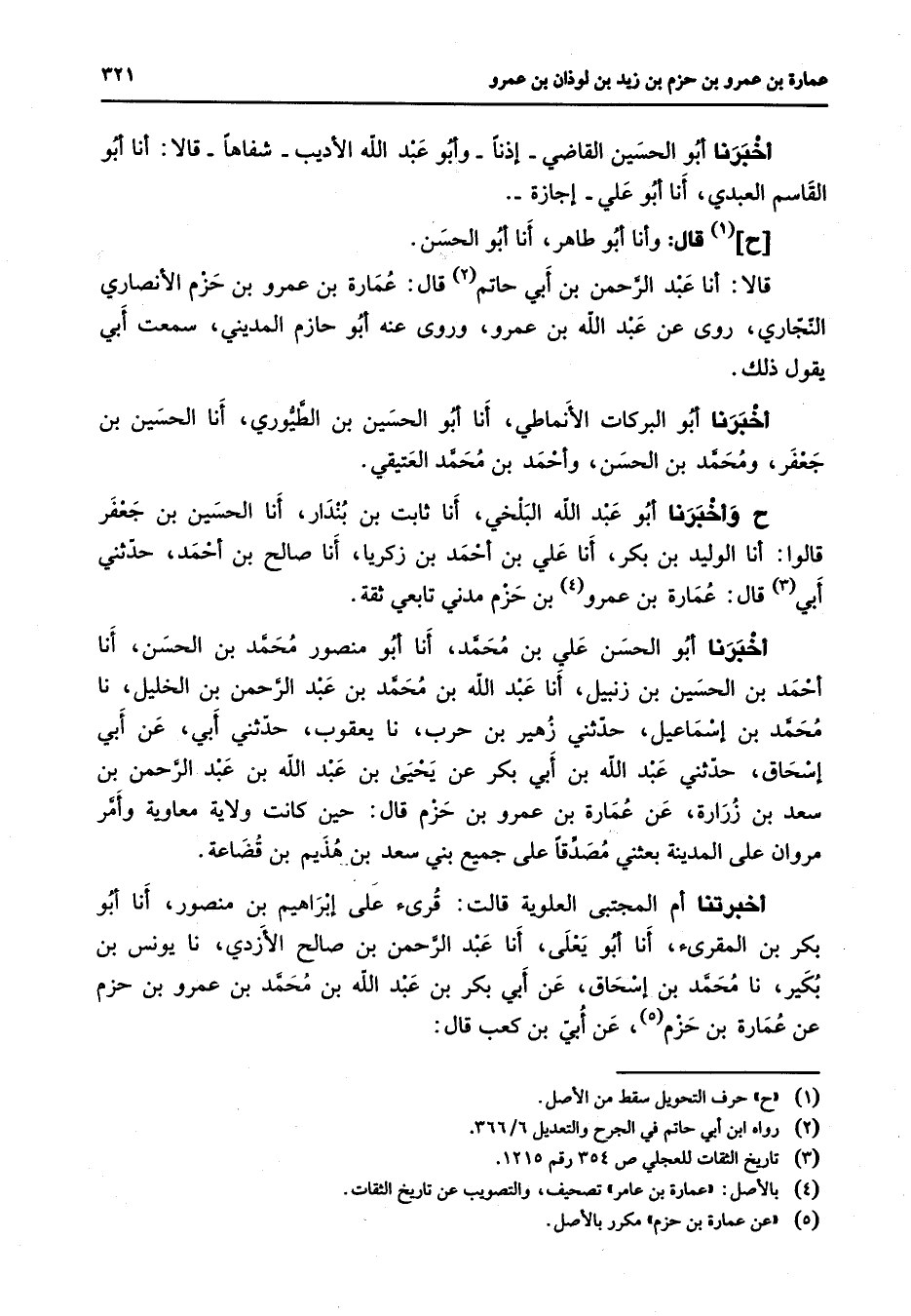 أخبرنا أبو الحسين القاضي إذنا وأبو عبد الله الأديب شفاها قالا أنا أبو القاسم العبدي أنا أبو علي إجازة ح (1) قال وأنا أبو طاهر أنا أبو الحسن قالا أنا عبد الرحمن بن أبي حاتم (2) قال عمارة بن عمرو بن حزم الأنصاري النجاري روى عن عبد الله بن عمرو وروى عنه أبو حازم المديني سمعت أبي يقول ذلك أخبرنا أبو البركات الأنماطي أنا أبو الحسين بن الطيوري أنا الحسين بن جعفر ومحمد بن الحسن وأحمد بن محمد العتيقي ح وأخبرنا أبو عبد الله البلخي أنا ثابت بن بندار أنا الحسين بن جعفر قالوا أنا الوليد بن بكر أنا علي بن أحمد بن زكريا أنا صالح بن أحمد حدثني أبي (3) قال عمارة بن عمرو (4) بن حزم مدني تابعي ثقة أخبرنا أبو الحسن علي بن محمد أنا أبو منصور محمد بن الحسن أنا أحمد بن الحسين بن زنبيل أنا عبد الله بن محمد بن عبد الرحمن بن الخليل نا محمد بن إسماعيل حدثني زهير بن حرب نا يعقوب حدثني أبي عن أبي إسحاق حدثني عبد الله بن أبي بكر عن يحيى بن عبد الله بن عبد الرحمن بن سعد بن زرارة عن عمارة بن عمرو بن حزم قال حين كانت ولاية معاوية وأمر مروان على المدينة بعثني مصدقا على جميع بني سعد بن هذيم بن قضاعة أخبرتنا أم المجتبى العلوية قالت قرئ على إبراهيم بن منصور أنا أبو بكر بن المقرئ أنا أبو يعلى أنا عبد الرحمن بن صالح الأزدي نا يونس بن بكير نا محمد بن إسحاق عن أبي بكر بن عبد الله بن محمد بن عمرو بن حزم عن عمارة بن حزم (5) عن أبي بن كعب قال