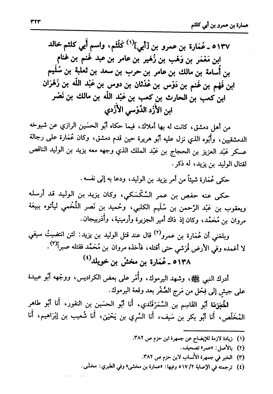 5138 - عمارة بن مخش بن خويلد (4) أدرك النبي (صلى الله عليه وسلم) وشهد اليرموك وأمر على بعض الكراديس ووجهه أبو عبيدة على جيش إلى فحل من مرج الصفر بعد وقعه اليرموك أخبرنا أبو القاسم بن السمرقندي أنا أبو الحسين بن النقور أنا أبو طاهر المخلص أنا أبو بكر بن سيف أنا السري بن يحيى أنا شعيب بن إبراهيم أنا * (هماش) * (1) زيادة غير لازمة للإيضاح عن جمهرة ابن حزم ص 382