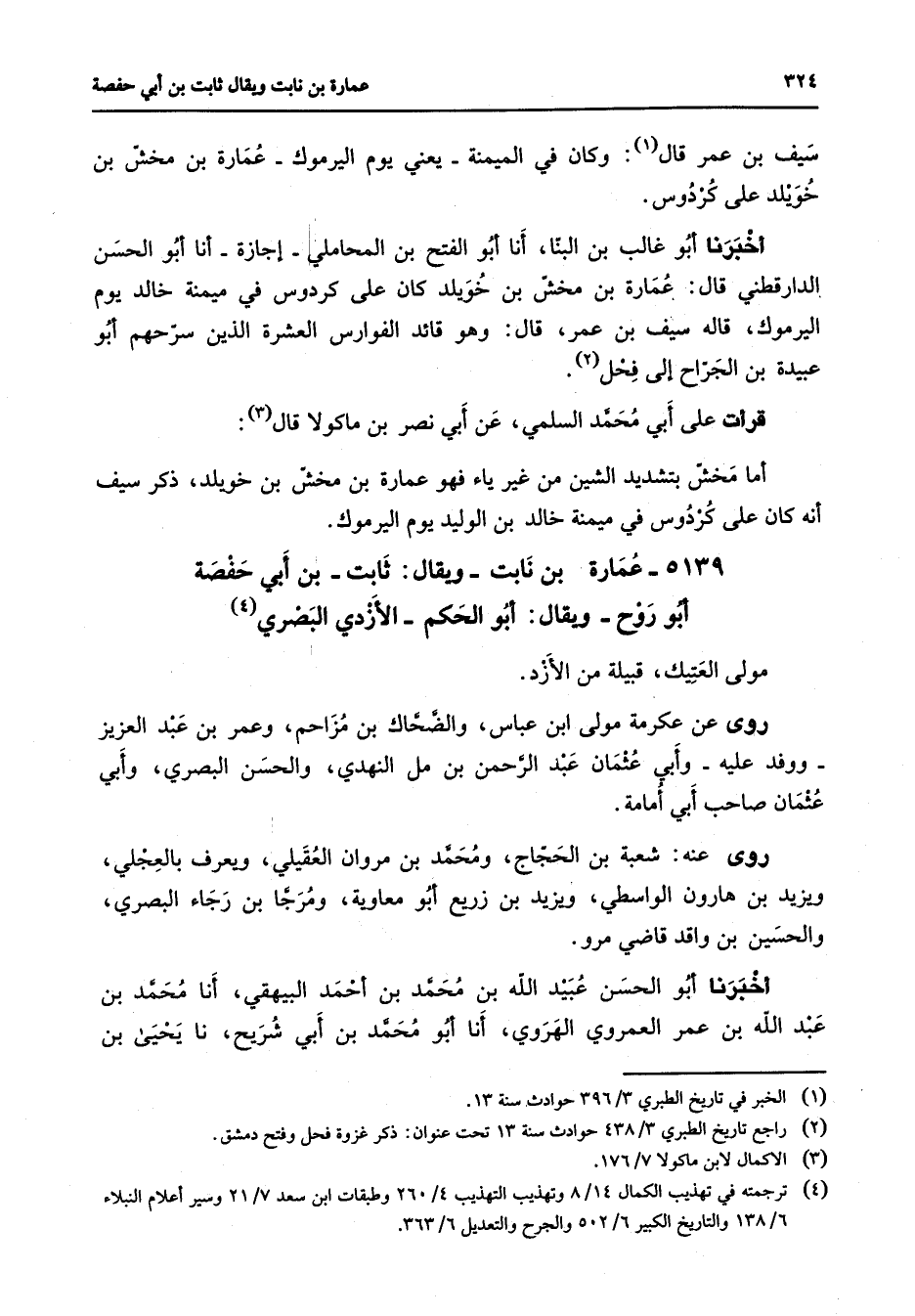 سيف بن عمر قال (1) وكان في الميمنة يعني يوم اليرموك عمارة بن مخش بن خويلد على كردوس أخبرنا أبو غالب بن البنا أنا أبو الفتح بن المحاملي إجازة أنا أبو الحسن الدارقطني قال عمارة بن مخش بن خويلد كان على كردوس في ميمنة خالد يوم اليرموك قاله سيف بن عمر قال وهو قائد الفوارس العشرة الذين سرحهم أبو عبيدة بن الجراح إلى فحل (2) قرأت على أبي محمد السلمي عن أبي نصر بن ماكولا قال (3) أما مخش بتشديد الشين من غير ياء فهو عمارة بن مخش بن خويلد ذكر سيف أنه كان على كردوس في ميمنة خالد بن الوليد يوم اليرموك