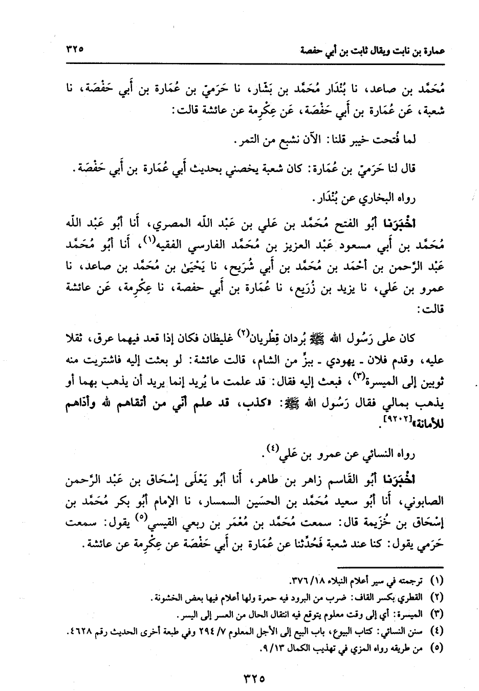 محمد بن صاعد نا بندار محمد بن بشار نا حرمي بن عمارة بن أبي حفصة نا شعبة عن عمارة بن أبي حفصة عن عكرمة عن عائشة قالت لما فتحت خيبر قلنا الآن نشبع من التمر قال لنا حرمي بن عمارة كان شعبة يخصني بحديث أبي عمارة بن أبي حفصة رواه البخاري عن بندار أخبرنا أبو الفتح محمد بن علي بن عبد الله المصري أنا أبو عبد الله محمد بن أبي مسعود عبد العزيز بن محمد الفارسي الفقيه (1) أنا أبو محمد عبد الرحمن بن أحمد بن محمد بن أبي شريح نا يحيى بن محمد بن صاعد نا عمرو بن علي نا يزيد بن زريع نا عمارة بن أبي حفصة نا عكرمة عن عائشة قالت كان على رسول الله (صلى الله عليه وسلم) بردان قطريان (2) غليظان فكان إذا قعد فيهما عرق ثقلا عليه وقدم فلان يهودي ببز من الشام قالت عائشة لو بعثت إليه فاشتريت منه ثوبين إلى الميسرة (3) فبعث إليه فقال قد علمت ما يريد إنما يريد أن يذهب بهما أو يذهب بمالي فقال رسول الله (صلى الله عليه وسلم) كذب قد علم أني من أتقاهم لله وأداهم للأمانة
