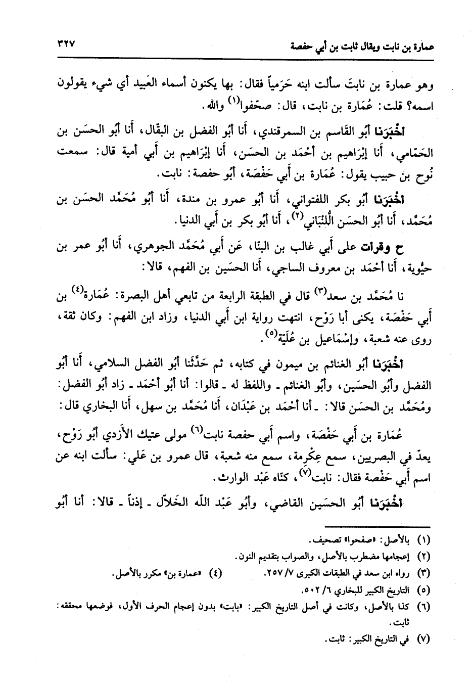 وهو عمارة بن نابت سألت ابنه حرميا فقال بها يكنون أسماء العبيد أي شئ يقولون اسمه قلت عمارة بن نابت قال صحفوا (1) والله أخبرنا أبو القاسم بن السمرقندي أنا أبو الفضل بن البقال أنا أبو الحسن بن الحمامي أنا إبراهيم بن أحمد بن الحسن أنا إبراهيم بن أبي أمية قال سمعت نوح بن حبيب يقول عمارة بن أبي حفصة أبو حفصة نابت أخبرنا أبو بكر اللفتواني أنا أبو عمرو بن مندة أنا أبو محمد الحسن بن محمد أنا أبو الحسن اللنباني (2) أنا أبو بكر بن أبي الدنيا ح وقرأت على أبي غالب بن البنا عن أبي محمد الجوهري أنا أبو عمر بن حيوية أنا أحمد بن معروف الساجي أنا الحسين بن الفهم قالا نا محمد بن سعد (3) قال في الطبقة الرابعة من تابعي أهل البصرة عمارة (4) بن أبي حفصة يكنى أبا روح انتهت رواية ابن أبي الدنيا وزاد ابن الفهم وكان ثقة روى عنه شعبة وإسماعيل بن علية (5) أخبرنا أبو الغنائم بن ميمون في كتابه ثم حدثنا أبو الفضل السلامي أنا أبو الفضل وأبو الحسين وأبو الغنائم واللفظ له قالوا أنا أبو أحمد زاد أبو الفضل ومحمد بن الحسن قالا أنا أحمد بن عبدان أنا محمد بن سهل أنا البخاري قا عمارة بن أبي حفصة واسم أبي حفصة نابت (6) مولى عتيك الأزدي أبو روح يعد في البصريين سمع عكرمة سمع منه شعبة قال عمرو بن علي سألت ابنه عن اسم أبي حفصة فقال نابت (7) كناه عبد الوارث أخبرنا أبو الحسين القاضي وأبو عبد الله الخلال إذنا قالا أنا أبو