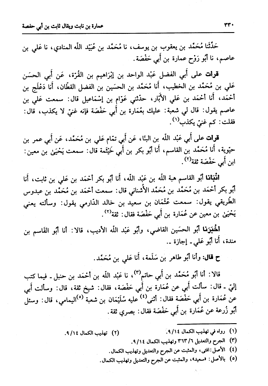 حدثنا محمد بن يعقوب بن يوسف نا محمد بن عبيد الله المنادي نا علي بن عاصم نا أبو روح عمارة بن أبي حفصة قرأت على أبي الفضل عبد الواحد بن إبراهيم بن القرة عن أبي الحسن علي بن محمد بن الخطيب أنا محمد بن الحسين بن الفضل القطان أنا دعلج بن أحمد أنا أحمد بن علي الأبار حدثني عوام بن إسماعيل قال سمعت علي بن عاصم يقول قال لي شعبة عليك بعمارة بن أبي حفصة فإنه غني لا يكذب قال فقلت كم غني يكذب (1) قرأت على أبي عبد الله بن البنا عن أبي تمام علي بن محمد عن أبي عمر بن حيوية أنا محمد بن القاسم أنا أبو بكر بن أبي خيثمة قال سمعت يحيى بن معين ابن أبي حفصة ثقة (2) أنبأنا أبو القاسم هبة الله بن عبد الله أنا أبو بكر أحمد بن علي بن ثابت أنا أبو بكر أحمد بن محمد بن محمد الأشناني قال سمعت أحمد بن محمد بن عبدوس الطريقي يقول سمعت عثمان بن سعيد بن خالد الدارمي يقول وسألته يعني يحيى بن معين عن عمارة بن أبي حفصة فقال ثقة (2) أخبرنا أبو الحسين القاضي وأبو عبد الله الأديب قالا أنا أبو القاسم بن مندة أنا أبو علي إجازة ح قال وأنا أبو طاهر بن سلمة أنا علي بن محمد قالا أنا أبو محمد بن أبي حاتم (3) نا عبد الله بن أحمد بن حنبل فيما كتب إلي قال سألت أبي عن عمارة بن أبي حفصة فقال شيخ ثقة قال وسألت أبي عن عمارة بن أبي حفصة فقال أثنى (4) عليه سليمان بن شعبة (5) اليمامي قال وسئل أبو زرعة عن عمارة بن أبي حفصة فقال بصري ثقة
