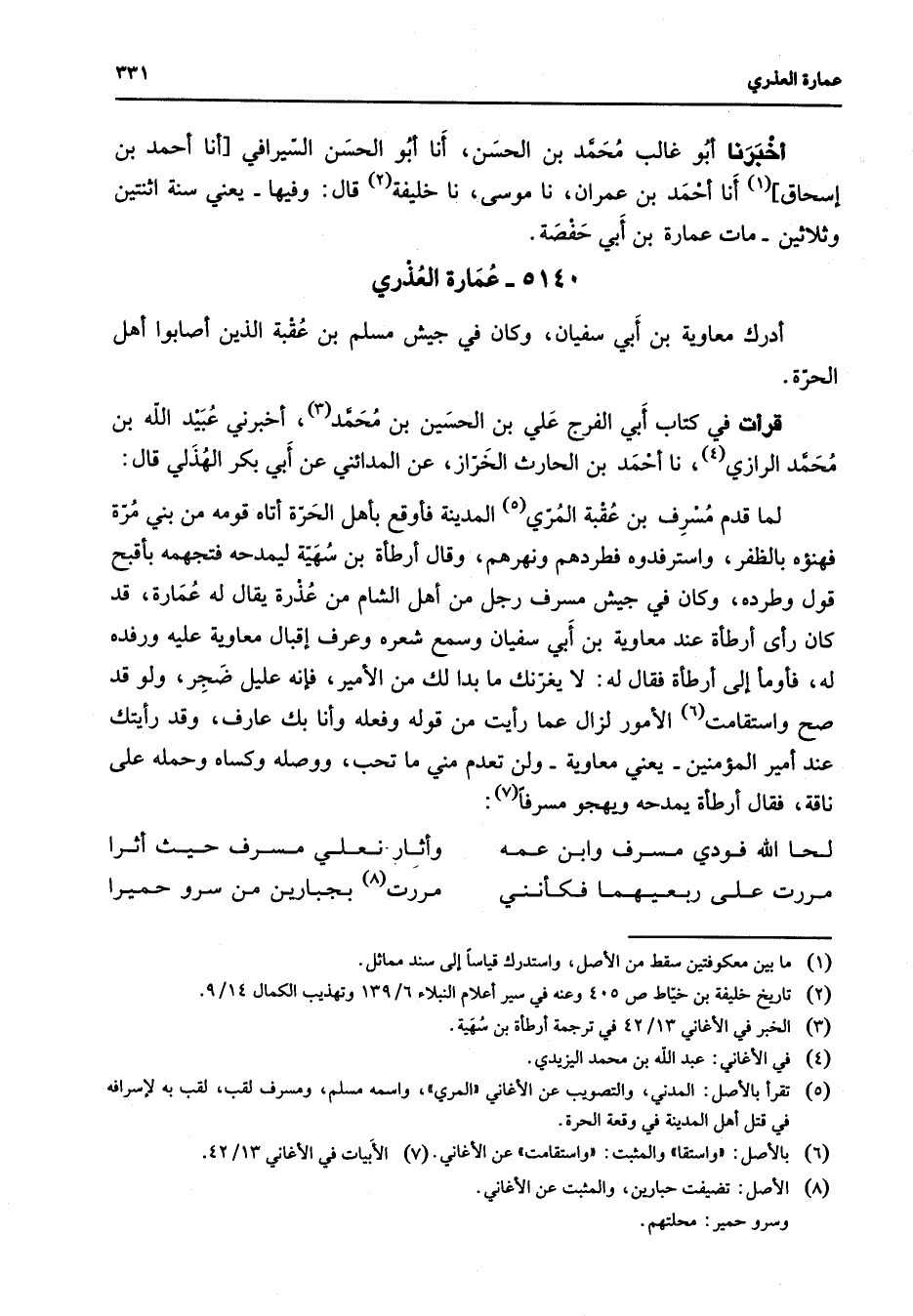5140 - عمارة العذري أدرك معاوية بن أبي سفيان وكان في جيش مسلم بن عقبة الذين أصابوا أهل الحرة قرأت في كتاب أبي الفرج علي بن الحسين بن محمد (3) أخبرني عبيد الله بن محمد الرازي (4) نا أحمد بن الحارث الخراز عن المدائني عن أبي بكر الهذلي قال لما قدم مسرف بن عقبة المري (5) المدينة فأوقع بأهل الحرة أتاه قومه من بني مرة فهنؤه بالظفر واسترفدوه فطردهم ونهرهم وقال أرطأة بن سهية ليمدحه فتجهمه بأقبح قول وطرده وكان في جيش مسرف رجل من أهل الشام من عذرة يقال له عمارة قد كان رأى أرطأة عند معاوية بن أبي سفيان وسمع شعره وعرف إقبال معاوية عليه ورفده له فأومأ إلى أرطأة فقال له لا يغرنك ما بدا لك من الأمير فإنه عليل ضجر ولو قد صح واستقامت (6) الأمور لزال عما رأيت من قوله وفعله وأنا بك عارف وقد رأيتك عند أمير المؤمنين يعني معاوية ولن تعدم مني ما تحب ووصله وكساه وحمله على ناقة فقال أرطأة يمدحه ويهجو مسرفا (7) * لحا الله فودي مسرف وابن عمه * وأثار نعلي مسرف حيث أثرا مررت على ربعيهما فكأنني * مررت (8) بجبارين من سرو حميرا