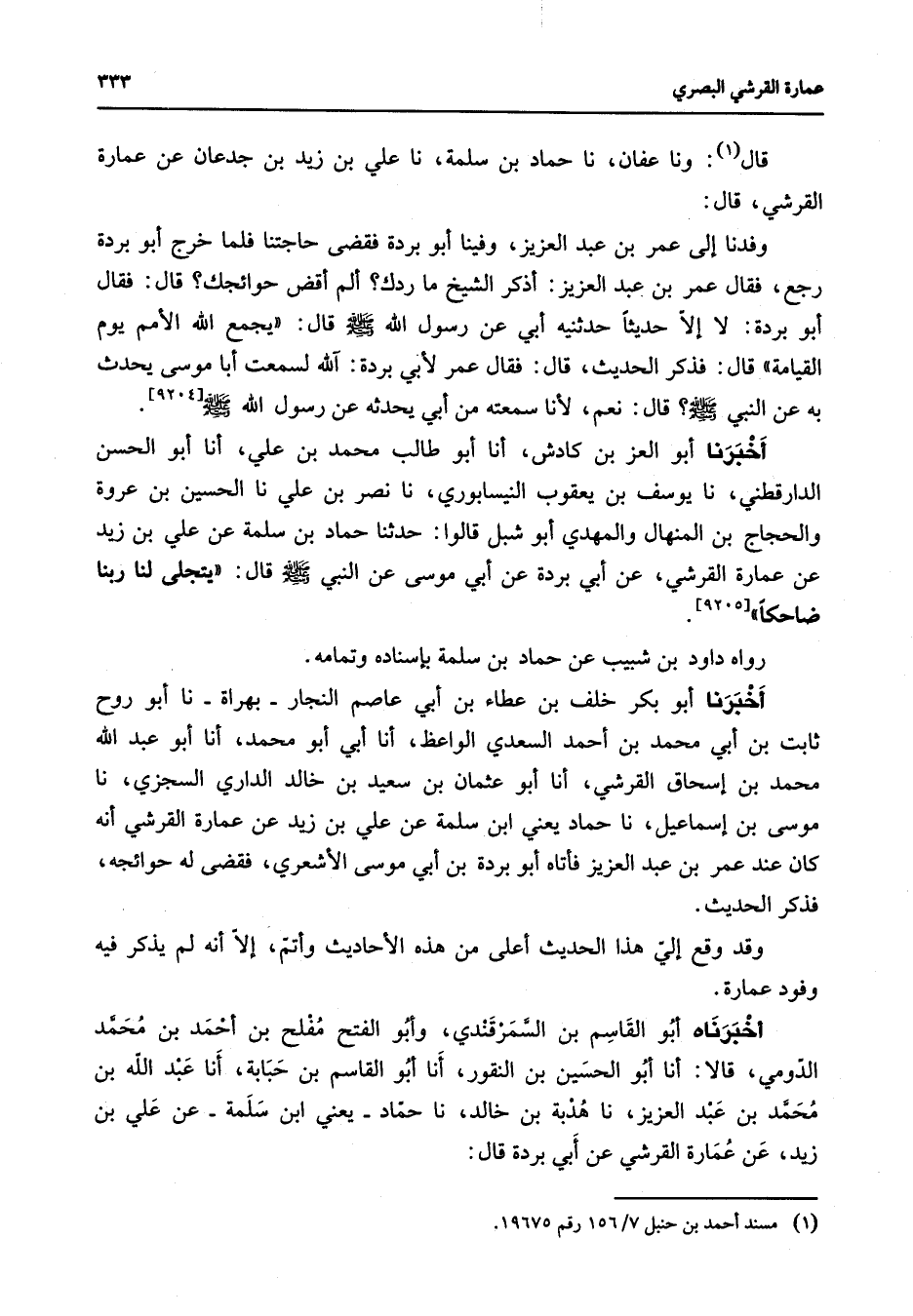 قال (1) ونا عفان نا حماد بن سلمة نا علي بن زيد بن جدعان عن عمارة القرشي قال وفدنا إلى عمر بن عبد العزيز وفينا أبو بردة فقضى حاجتنا فلما خرج أبو بردة رجع فقال عمر بن عبد العزيز أذكر الشيخ ما ردك ألم أقض حوائجك قال فقال أبو بردة لا إلا حديثا حدثنيه أبي عن رسول الله (صلى الله عليه وسلم) قال يجمع الله الأمم يوم القيامة قال فذكر الحديث قال فقال عمر لأبي بردة آلله لسمعت أبا موسى يحدث به عن النبي (صلى الله عليه وسلم) قال نعم لأنا سمعته من أبي يحدثه عن رسول الله صلى الله عليه وسلم