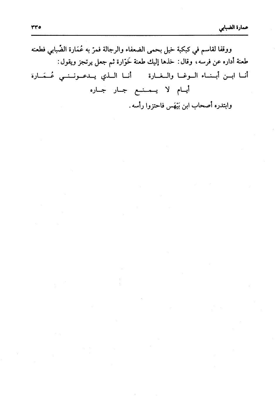 ووقفا لقاسم في كبكبة خيل بحمى الضعفاء والرجالة فمر به عمارة الضبابي فطعنه طعنة أداره عن فرسه وقال خذها إليك طعنة خوارة ثم جعل يرتجز ويقول * أنا ابن أبناء الوغا والغارة * أنا الذي يدعونني عمارة أيام لا يمنع جار جاره وابتدره أصحاب ابن بيهس فاحتزروا رأسه