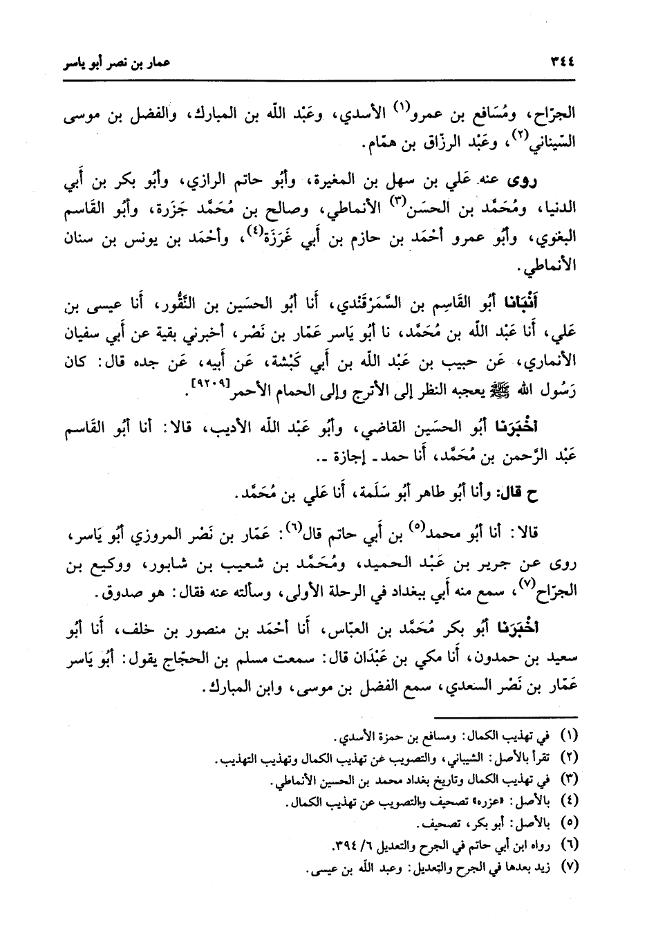 [9209] أخبرنا أبو الحسين القاضي وأبو عبد الله الأديب قالا أنا أبو القاسم عبد الرحمن بن محمد أنا أحمد إجازة ح قال وأنا أبو طاهر أبو سلمة أنا علي بن محمد قالا أنا أبو محمد (5) بن أبي حاتم قال (6) عمار بن نصر المروزي أبو ياسر روى عن جرير بن عبد الحميد ومحمد بن شعيب بن شابور ووكيع بن الجراح (7) سمع منه أبي ببغداد في الرحلة الأولى وسألته عنه فقال هو صدوق أخبرنا أبو بكر محمد بن العباس أنا أحمد بن منصور بن خلف أنا أبو سعيد بن حمدون أنا مكي بن عبدان قال سمعت مسلم بن الحجاج يقول أبو ياسر عمار بن نصر السعدي سمع الفضل بن موسى وابن المبارك