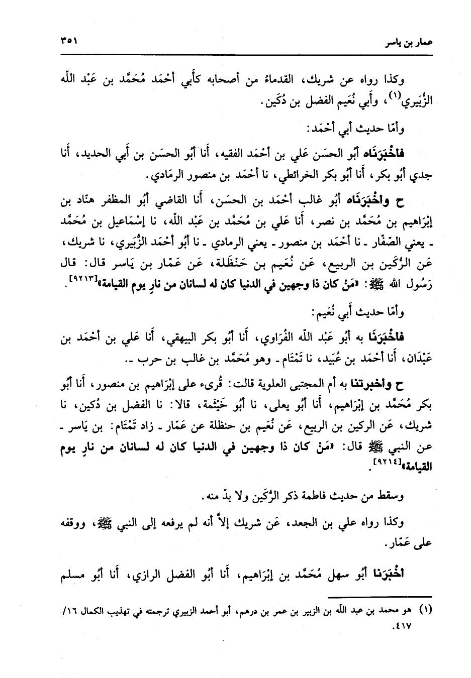 وكذا رواه عن شريك القدماء من أصحابه كأبي أحمد محمد بن عبد الله الزبيري (1) وأبي نعيم الفضل بن دكين وأما حديث أبي أحمد فأخبرناه أبو الحسن علي بن أحمد الفقيه أنا أبو الحسن بن أبي الحديد أنا جدي أبو بكر أنا أبو بكر الخرائطي نا أحمد بن منصور الرمادي ح وأخبرناه أبو غالب أحمد بن الحسن أنا القاضي أبو المظفر هناد بن إبراهيم بن محمد بن نصر أنا علي بن محمد بن عبد الله نا إسماعيل بن محمد يعني الصفار نا أحمد بن منصور يعني الرمادي نا أبو أحمد الزبيري نا شريك عن الركين بن الربيع عن نعيم بن حنظلة عن عمار بن ياسر قال قال رسول الله (صلى الله عليه وسلم) من كان ذا وجهين في الدنيا كان له لسانان من نار يوم القيامة