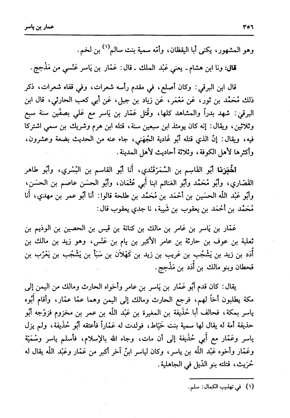 وهو المشهور يكنى أبا اليقظان وأمه سمية بنت سالم (1) بن لخم قال ونا ابن هشام يعني عبد الملك قال عمار بن ياسر عنسي من مذحج قال ابن البرقي وكان أصلع في مقدم رأسه شعرات وفي قفاه شعرات ذكر ذلك محمد بن ثور عن معمر عن زياد بن جبل عن أبي كعب الحارثي قال ابن البرقي شهد بدرا والمشاهد كلها وقتل عمار بن ياسر مع علي بصفين سنة سبع وثلاثين ويقال إنه كان يومئذ ابن سبعين سنة قتله ابن هرم وشريك بن سمي اشتركا فيه ويقال إن الذي قتله أبو غادية الجهني جاء عنه من الحديث بضعة وعشرون وأكثرها لأهل الكوفة وثلاثة أحاديث لأهل المدينة أخبرنا أبو القاسم بن السمرقندي أنا أبو القاسم بن البسري وأبو طاهر القصاري وأبو محمد وأبو الغنائم ابنا أبي عثمان وأبو الحسن عاصم بن الحسن وأبو عبد الله الحسين بن أحمد بن محمد بن طلحة قالوا أنا أبو عمر بن مهدي أنا محمد بن أحمد بن يعقوب بن شيبة نا جدي يعقوب قال عمار بن ياسر بن عامر بن مالك بن كنانة بن قيس بن الحصين بن الوذيم بن ثعلبة بن عوف بن حارثة بن عامر الأكبر بن يام بن عنس وهو زيد بن مالك بن أدد بن زيد بن يشجب بن عريب بن زيد بن كهلان بن سبأ بن يشجب بن يعرب بن قحطان وبنو مالك بن أدد بن مذحج يقال كان قدم أبو عمار بن ياسر بن عامر وأخواه الحارث ومالك من اليمن إلى مكة يطلبون أخا لهم فرجع الحارث ومالك إلى اليمن وهما عما عمار وأقام أبوه ياسر بمكة فحالف أبا حذيفة بن المغيرة بن عبد الله بن عمر بن مخزوم فزوجه أبو حذيفة أمة له يقال لها سمية بنت خياط فولدت له عمارا فأعتقه أبو حذيفة ولم يزل ياسر وعمار مع أبي حذيفة إلى أن مات وجاء الله بالإسلام فأسلم ياسر وسمية وعمار وأخوه عبد الله بن ياسر وكان لياسر ابن آخر أكبر من عمار وعبد الله يقال له حريث قتلته بنو الديل في الجاهلية