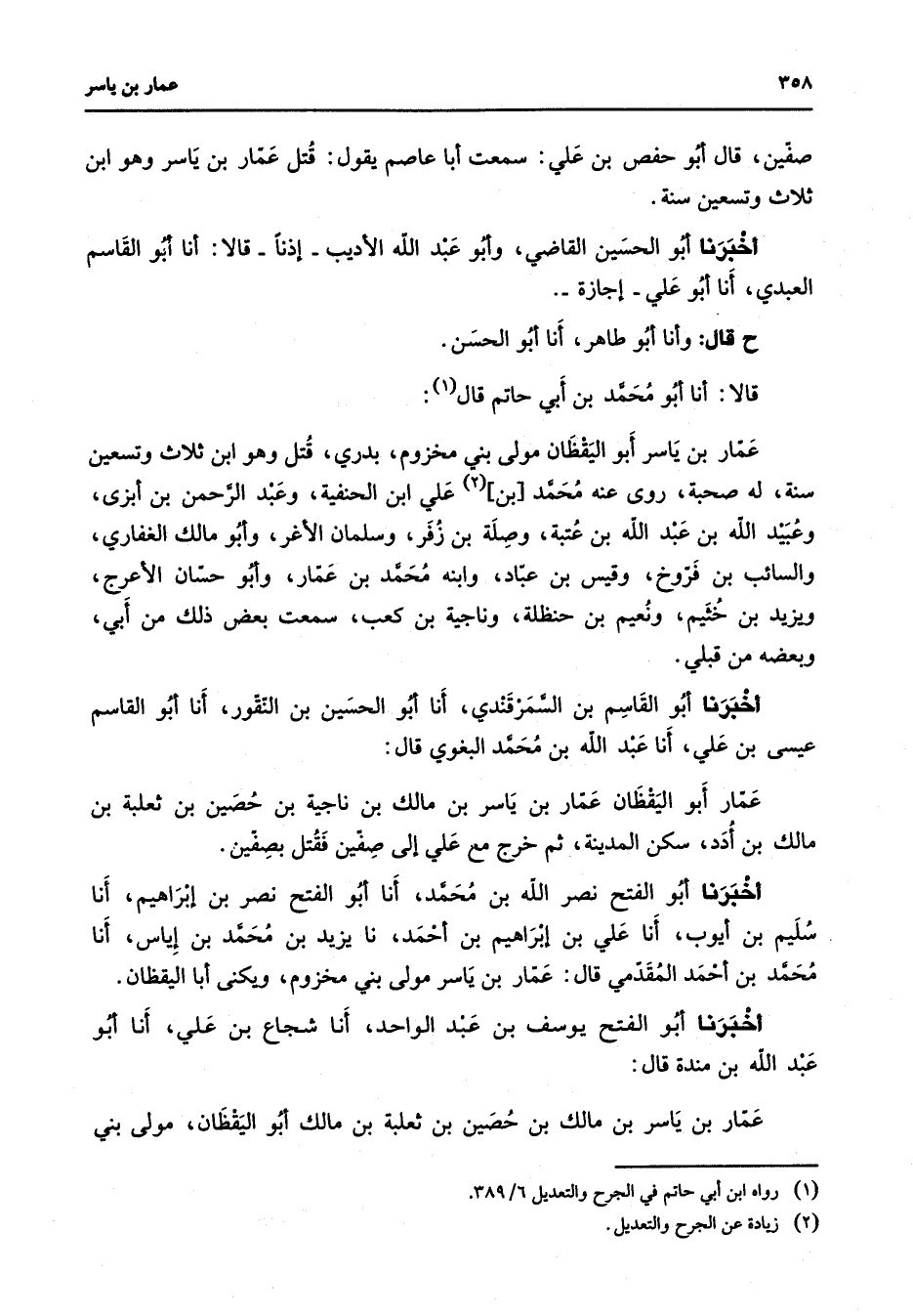 صفين قال أبو حفص بن علي سمعت أبا عاصم يقول قتل عمار بن ياسر وهو ابن ثلاث وتسعين سنة سنة أخبرنا أبو الحسين القاضي وأبو عبد الله الأديب إذنا قالا أنا أبو القاسم العبدي أنا أبو علي إجازة ح قال وأنا أبو طاهر أنا أبو الحسن قالا أنا أبو محمد بن أبي حاتم قال (1) عمار بن ياسر أبو اليقظان مولى بني مخزوم بدري قتل وهو ابن ثلاث وتسعين سنة له صحبة روى عنه محمد بن (2) علي ابن الحنفية وعبد الرحمن بن أبزى وعبيد الله بن عبد الله بن عتبة وصلة بن زفر وسلمان الأغر وأبو مالك الغفاري والسائب بن فروخ وقيس بن عباد وابنه محمد بن عمار وأبو حسان الأعرج ويزيد بن خثيم ونعيم بن حنظلة وناجية بن كعب سمعت بعض ذلك من أبي وبعضه من قبلي أخبرنا أبو القاسم بن السمرقندي أنا أبو الحسين بن النقور أنا أبو القاسم عيسى بن علي أنا عبد الله بن محمد البغوي قال عمار أبو اليقظان عمار بن ياسر بن مالك بن ناجية بن حصين بن ثعلبة بن مالك بن أدد سكن المدينة ثم خرج مع علي إلى صفين فقتل بصفين أخبرنا أبو الفتح نصر الله بن محمد أنا أبو الفتح نصر بن إبراهيم أنا سليم بن أيوب أنا علي بن إبراهيم بن أحمد نا يزيد بن محمد بن إياس أنا محمد بن أحمد المقدمي قال عمار بن ياسر مولى بني مخزوم ويكنى أبا اليقظان أخبرنا أبو الفتح يوسف بن عبد الواحد أنا شجاع بن علي أنا أبو عبد الله بن مندة قال عمار بن ياسر بن مالك بن حصين بن ثعلبة بن مالك أبو اليقظان مولى بني