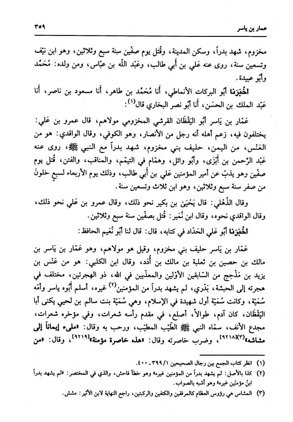 مخزوم شهد بدرا وسكن المدينة وقتل يوم صفين سنة سبع وثلاثين وهو ابن نيف وتسعين سنة روى عنه علي بن أبي طالب وعبد الله بن عباس ومن ولده محمد وأبو عبيدة أخبرنا أبو البركات الأنماطي أنا محمد بن طاهر أنا مسعود بن ناصر أنا عبد الملك بن الحسن أنا أبو نصر البخاري قال (1) عمار بن ياسر أبو اليقظان القرشي المخزومي مولاهم قال عمرو بن علي يختلفون فيه زعم أهله أنه رجل من الانصار وهو الكوفي وقال الواقدي هو من العنس من اليمن حليف بني مخزوم شهد بدرا مع النبي (صلى الله عليه وسلم) روى عنه عبد الرحمن بن أبزى وأبو وائل وهمام في التيمم والمناقب والفتن قتل يوم صفين وهو يذب عن أمير المؤمنين علي بن أبي طالب وذلك يوم الأربعاء لسبع خلون من صفر سنة سبع وثلاثين وهو ابن ثلاث وتسعين سنة وقال الذهلي قال يحيى بن بكير نحو ذلك وقال عمرو بن علي نحو ذلك وقال الواقدي نحوه وقال ابن نمير قتل بصفين سنة سبع وثلاثين أخبرنا أبو علي الحداد في كتابه قال قال لنا أبو نعيم الحافظ عمار بن ياسر حليف بني مخزوم وقيل هو مولاهم وهو عمار بن ياسر بن مالك بن حصين بن ثعلبة بن مالك بن أدد وقال ابن الكلبي هو من عنس بن يزيد بن مذحج من السابقين الأولين والمعذبين في الله ذو الهجرتين مختلف في هجرته إلى الحبشة بدري لم يشهد بدرا من المؤمنين (2) غيره أسلم أبوه ياسر وأمه سمية وكانت سمية أول شهيدة في الإسلام وهي سمية بنت سالم بن لحيي يكنى أبا اليقظان كان آدم طوالا أصلع في مقدم رأسه شعرات وفي مؤخره شعرات مجدع الأنف سماه النبي (صلى الله عليه وسلم) الطيب المطيب ورحب به وقال ملئ إيمانا إلى مشاشه (3)