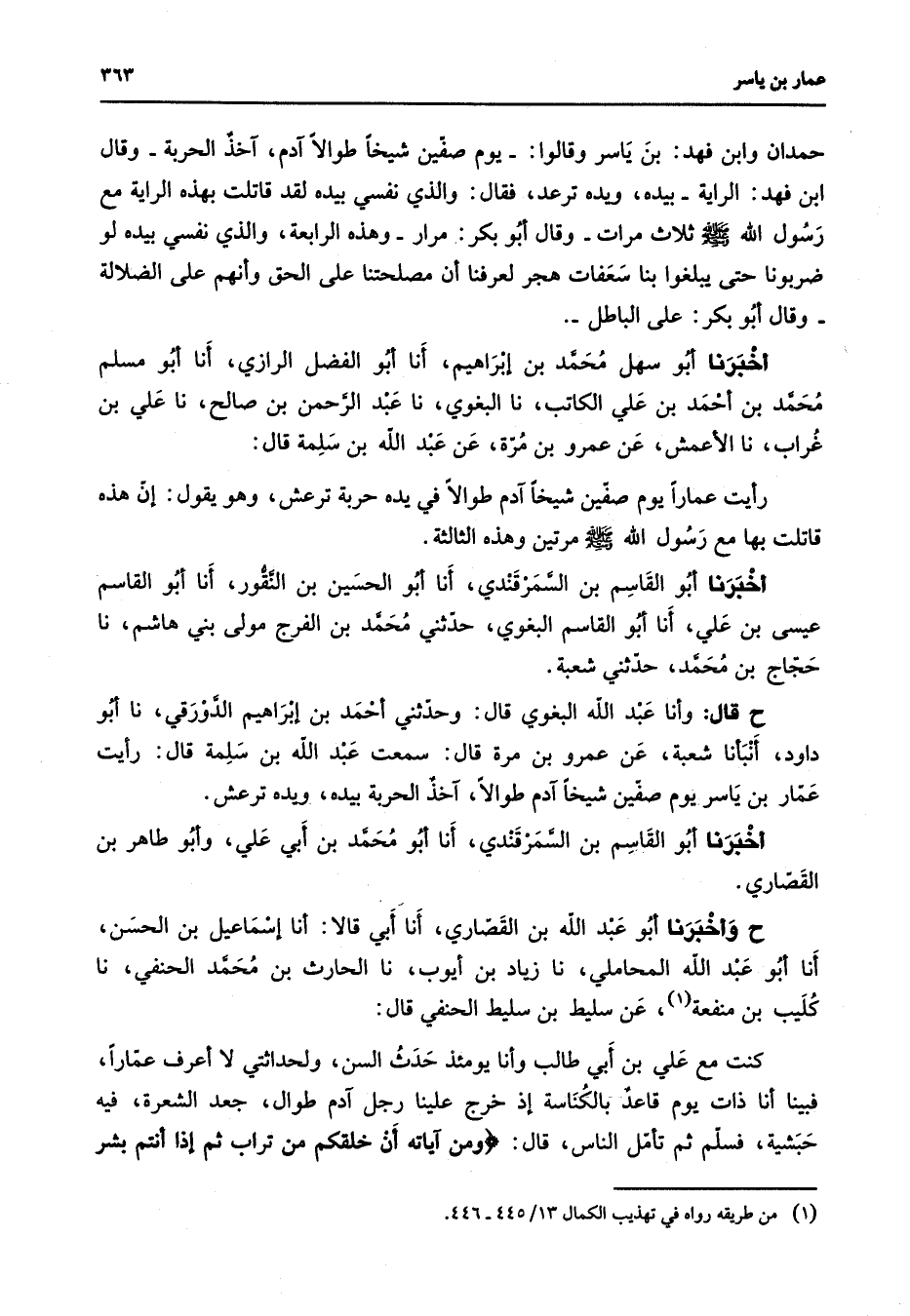 حمدان وابن فهد بن ياسر وقالوا يوم صفين شيخا طوالا آدم آخذ الحربة وقال ابن فهد الراية بيده ويده ترعد فقال والذي نفسي بيده لقد قاتلت بهذه الراية مع رسول الله (صلى الله عليه وسلم) ثلاث مرات وقال أبو بكر مرار وهذه الرابعة والذي نفسي بيده لو ضربونا حتى يبلغوا بنا سعفات هجر لعرفنا أن مصلحتنا على الحق وأنهم على الضلالة وقال أبو بكر على الباطل أخبرنا أبو سهل محمد بن إبراهيم أنا أبو الفضل الرازي أنا أبو مسلم محمد بن أحمد بن علي الكاتب نا البغوي نا عبد الرحمن بن صالح نا علي بن غراب نا الأعمش عن عمرو بن مرة عن عبد الله بن سلمة قال رأيت عمارا يوم صفين شيخا آدم طوالا في يده حربة ترعش وهو يقول إن هذه قاتلت بها مع رسول الله (صلى الله عليه وسلم) مرتين وهذه الثالثة أخبرنا أبو القاسم بن السمرقندي أنا أبو الحسين بن النقور أنا أبو القاسم عيسى بن علي أنا أبو القاسم البغوي حدثني محمد بن الفرج مولى بني هاشم نا حجاج بن محمد حدثني شعبة ح قال وأنا عبد الله البغوي قال وحدثني أحمد بن إبراهيم الدورقي نا أبو داود أنبأنا شعبة عن عمرو بن مرة قال سمعت عبد الله بن سلمة قال رأيت عمار بن ياسر يوم صفين شيخا آدم طوالا آخذ الحربة بيده ويده ترعش أخبرنا أبو القاسم بن السمرقندي أنا أبو محمد بن أبي علي وأبو طاهر بن القصاري ح وأخبرنا أبو عبد الله بن القصاري أنا أبي قالا أنا إسماعيل بن الحسن أنا أبو عبد الله المحاملي نا زياد بن أيوب نا الحارث بن محمد الحنفي نا كليب بن منفعة (1) عن سليط بن سليط الحنفي قال كنت مع علي بن أبي طالب وأنا يومئذ حدث السن ولحداثتي لا أعرف عمارا فبينا أنا ذات يوم قاعد بالكناسة إذ خرج علينا رجل آدم طوال جعد الشعرة فيه حبشية فسلم ثم تأمل الناس قال " ومن آياته أن خلقكم من تراب ثم إذا انتم بشر