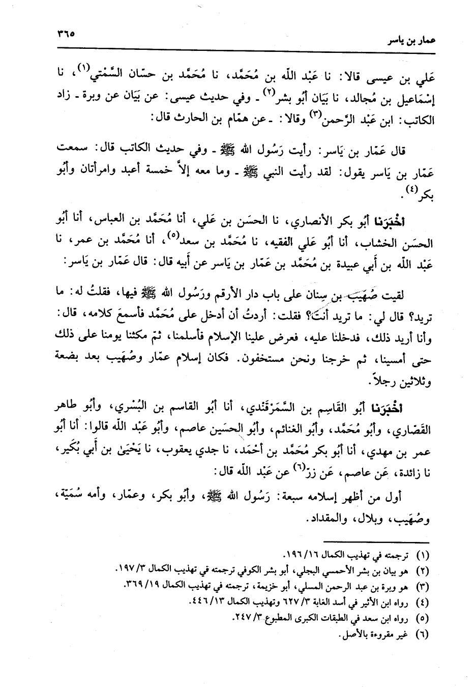 علي بن عيسى قالا نا عبد الله بن محمد نا محمد بن حسان السمتي (1) نا إسماعيل بن مجالد نا بيان أبو بشر (2) وفي حديث عيسى عن بيان عن وبرة زاد الكاتب ابن عبد الرحمن (3) وقالا عن همام بن الحارث قال قال عمار بن ياسر رأيت رسول الله (صلى الله عليه وسلم) وفي حديث الكاتب قال سمعت عمار بن ياسر يقول لقد رأيت النبي (صلى الله عليه وسلم) وما معه إلا خمسة أعبد وامرأتان وأبو بكر (4) أخبرنا أبو بكر الأنصاري نا الحسن بن علي أنا محمد بن العباس أنا أبو الحسن الخشاب أنا أبو علي الفقيه نا محمد بن سعد (5) أنا محمد بن عمر نا عبد الله بن أبي عبيدة بن محمد بن عمار بن ياسر عن أبيه قال قال عمار بن ياسر لقيت صهيب بن سنان على باب دار الأرقم ورسول الله (صلى الله عليه وسلم) فيها فقلت له ما تريد قال لي ما تريد أنت فقلت أردت أن أدخل على محمد فأسمع كلامه قال