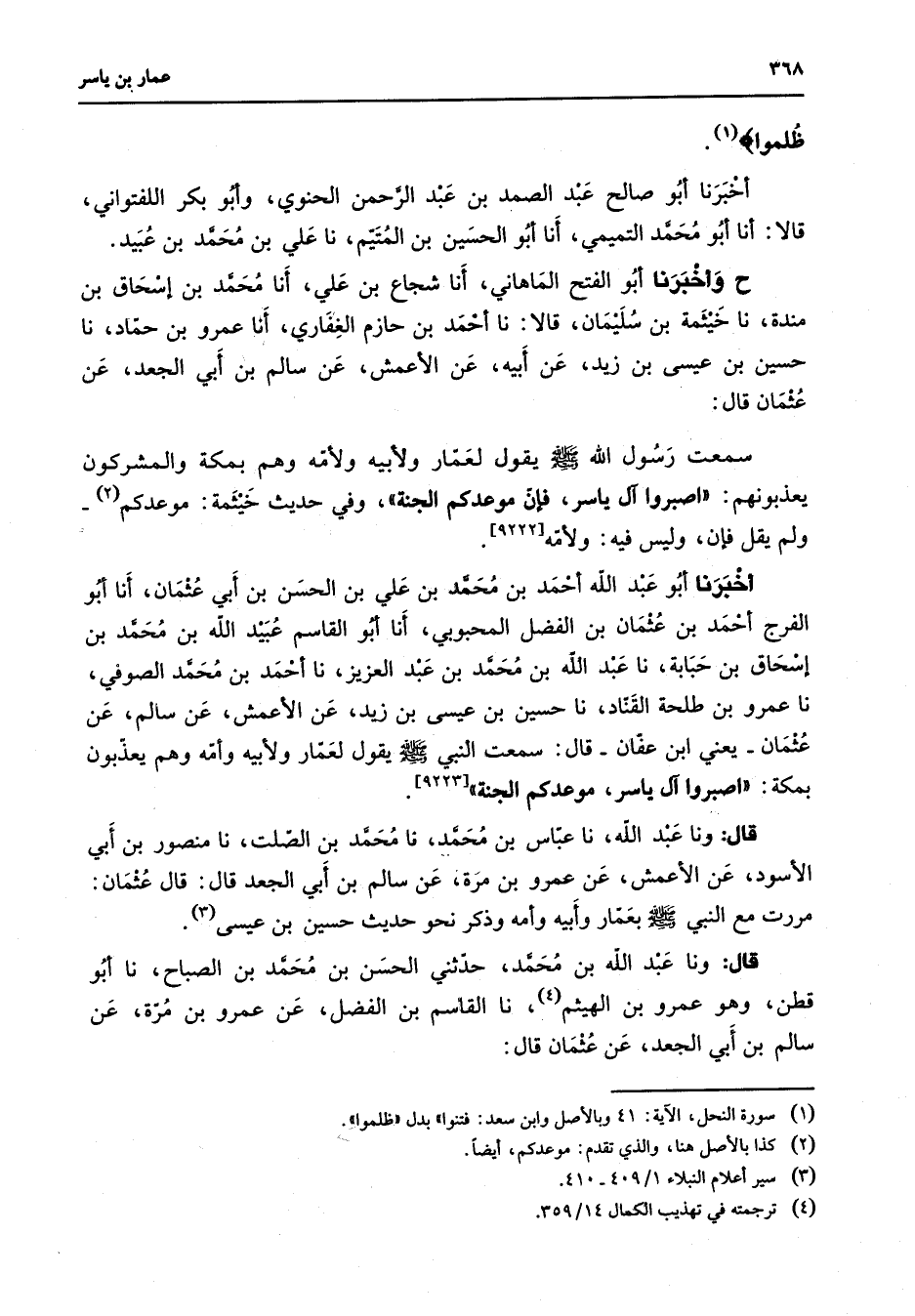 ظلموا " (1) أخبرنا أبو صالح عبد الصمد بن عبد الرحمن الحنوي وأبو بكر اللفتواني قالا أنا أبو محمد التميمي أنا أبو الحسين بن المتيم نا علي بن محمد بن عبيد ح وأخبرنا أبو الفتح الماهاني أنا شجاع بن علي أنا محمد بن إسحاق بن مندة نا خيثمة بن سليمان قالا نا أحمد بن حازم الغفاري أنا عمرو بن حماد نا حسين بن عيسى بن زيد عن أبيه عن الأعمش عن سالم بن أبي الجعد عن عثمان قال سمعت رسول الله (صلى الله عليه وسلم) يقول لعمار ولأبيه ولأمه وهم بمكة والمشركون يعذبونهم اصبروا آل ياسر فإن موعدكم الجنة وفي حديث خيثمة موعدكم (2) ولم يقل فإن وليس فيه ولأمه