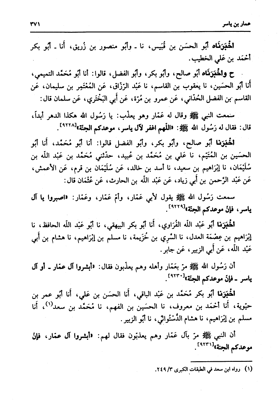 [9230] أخبرنا أبو بكر محمد بن عبد الباقي أنا الحسن بن علي أنا أبو عمر بن حيوية أنا أحمد بن معروف نا الحسين بن الفهم نا محمد بن سعد (1) أنا مسلم بن إبراهيم نا هشام الدستوائي نا أبو الزبير أن النبي (صلى الله عليه وسلم) مر بآل عمار وهم يعذبون فقال لهم أبشروا آل عمار فإن موعدكم الجنة