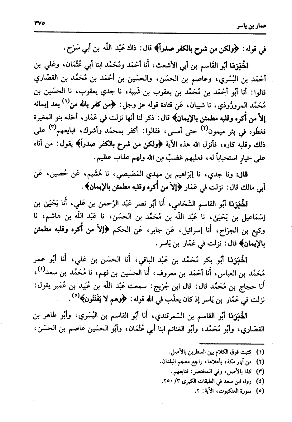في قوله " ولكن من شرح بالكفر صدرا " قال ذاك عبد الله بن أبي سرح أخبرنا أبو القاسم بن أبي الأشعث أنا أحمد ومحمد ابنا أبي عثمان وعلي بن أحمد بن البسري وعاصم بن الحسن والحسين بن أحمد بن محمد بن القصاري قالوا أنا أبو أحمد بن محمد بن يعقوب بن شيبة نا جدي يعقوب نا الحسين بن محمد المروروذي نا شيبان عن قتادة قوله عز وجل " من كفر بالله من (1) بعد إيمانه إلا من أكره وقلبه مطمئن بالإيمان " قال ذكر لنا أنها نزلت في عمار أخذه بنو المغيرة فغطوه في بئر ميمون (2) حتى أمسى فقالوا أكفر بمحمد وأشرك فبايعهم (3) على ذلك وقلبه كاره فأنزل الله هذه الآية " ولكن من شرح بالكفر صدرا " يقول من أتاه على خيار استحبابا له فعليهم غضب من الله ولهم عذاب عظيم قال ونا جدي نا إبراهيم بن مهدي المصيصي نا هشيم عن حصين عن أبي مالك قال نزلت في عمار " إلا من أكره وقلبه مطمئن بالإيمان " أخبرنا أبو القاسم الشحامي أنا أبو نصر عبد الرحمن بن علي أنا يحيى بن إسماعيل بن يحيى نا عبد الله بن محمد بن الحسن نا عبد الله بن هاشم نا وكيع بن الجراح أنا إسرائيل عن جابر عن الحكم " إلا من أكره وقلبه مطمئن بالإيمان " قال نزلت في عمار بن ياسر أخبرنا أبو بكر محمد بن عبد الباقي أنا الحسن بن علي أنا أبو عمر محمد بن العباس أنا أحمد بن معروف أنا الحسين بن فهم نا محمد بن سعد (4) أنا حجاج بن محمد قال قال ابن جريج سمعت عبد الله بن عبيد بن عمير يقول نزلت في عمار بن ياسر إذ كان يعذب في الله قوله " وهم لا يفتنون " (5) أخبرنا أبو القاسم بن السمرقندي أنا أبو القاسم بن البسري وأبو طاهر بن القصاري وأبو محمد وأبو الغنائم ابنا أبي عثمان وأبو الحسين عاصم بن الحسن