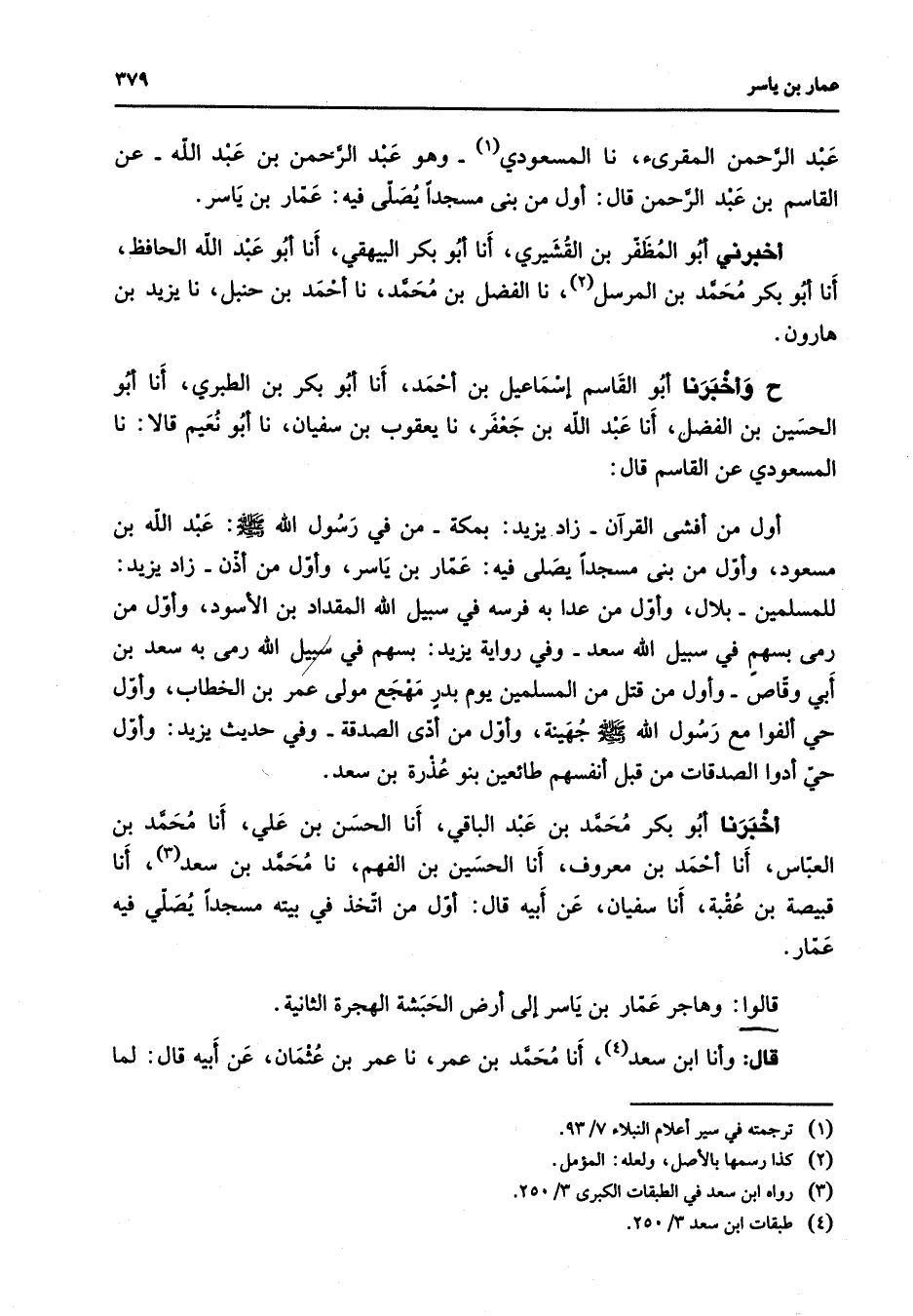 عبد الرحمن المقرئ نا المسعودي (1) وهو عبد الرحمن بن عبد الله عن القاسم بن عبد الرحمن قال أول من بنى مسجدا يصلى فيه عمار بن ياسر أخبرني أبو المظفر بن القشيري أنا أبو بكر البيهقي أنا أبو عبد الله الحافظ أنا أبو بكر محمد بن المرسل (2) نا الفضل بن محمد نا أحمد بن حنبل نا يزيد بن هارون ح وأخبرنا أبو القاسم إسماعيل بن أحمد أنا أبو بكر بن الطبري أنا أبو الحسين بن الفضل أنا عبد الله بن جعفر نا يعقوب بن سفيان نا أبو نعيم قالا نا المسعودي عن القاسم قال أول من أفشى القرآن زاد يزيد بمكة من في رسول الله (صلى الله عليه وسلم) عبد الله بن مسعود وأول من بنى مسجدا يصلى فيه عمار بن ياسر وأول من أذن زاد يزيد للمسلمين بلال وأول من عدا به فرسه في سبيل الله المقداد بن الأسود وأول من رمى بسهم في سبيل الله سعد وفي رواية يزيد بسهم في سبيل الله رمى به سعد بن أبي وقاص وأول من قتل من المسلمين يوم بدر مهجع مولى عمر بن الخطاب وأول حي ألفوا مع رسول الله (صلى الله عليه وسلم) جهينة وأول من أدى الصدقة وفي حديث يزيد وأول حي أدوا الصدقات من قبل أنفسهم طائعين بنو عذرة بن سعد أخبرنا أبو بكر محمد بن عبد الباقي أنا الحسن بن علي أنا محمد بن العباس أنا أحمد بن معروف أنا الحسين بن الفهم نا محمد بن سعد (3) أنا قبيصة بن عقبة أنا سفيان عن أبيه قال أول من اتخذ في بيته مسجدا يصلي فيه عمار قالوا وهاجر عمار بن ياسر إلى أرض الحبشة الهجرة الثانية قال وأنا ابن سعد (4) أنا محمد بن عمر نا عمر بن عثمان عن أبيه قال لما