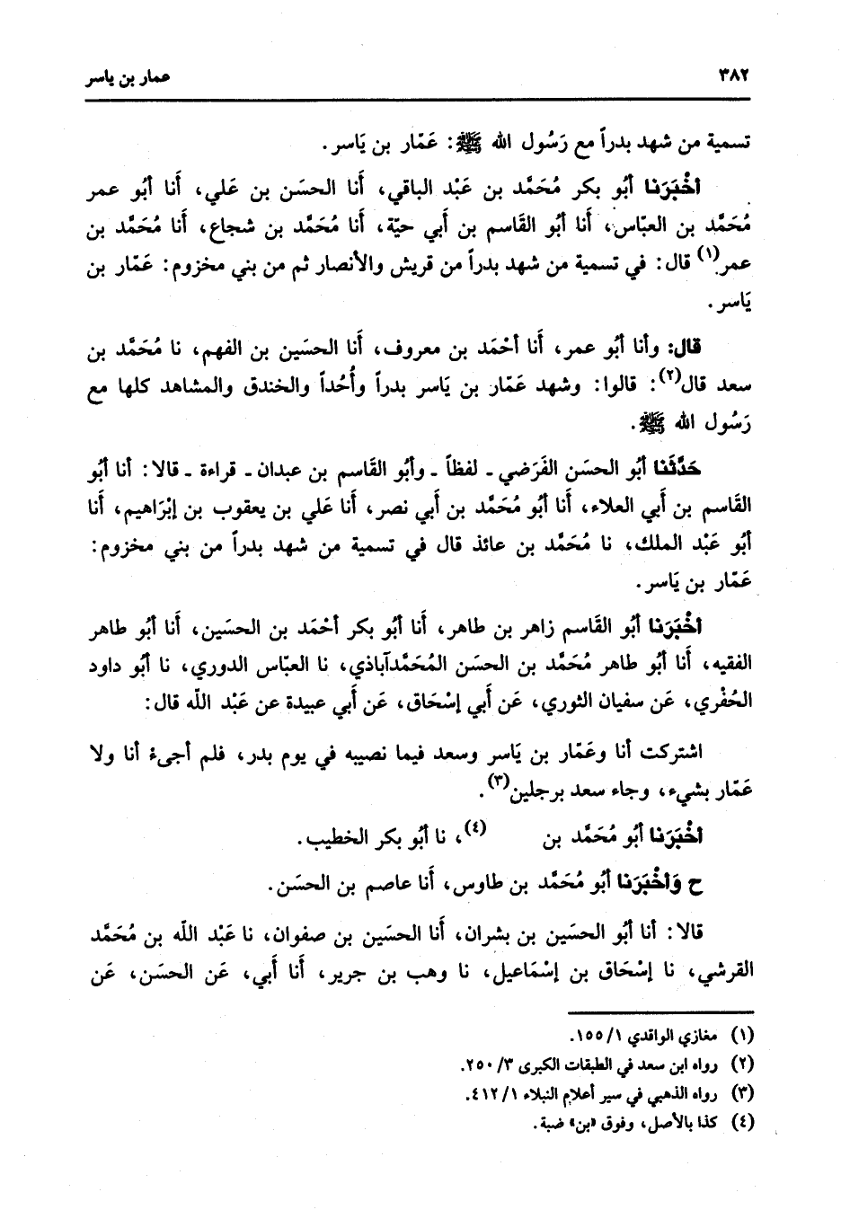 تسمية من شهد بدرا مع رسول الله (صلى الله عليه وسلم) عمار بن ياسر أخبرنا أبو بكر محمد بن عبد الباقي أنا الحسن بن علي أنا أبو عمر محمد بن العباس أنا أبو القاسم بن أبي حية أنا محمد بن شجاع أنا محمد بن عمر (1) قال في تسمية من شهد بدرا من قريش والأنصار ثم من بني مخزوم عمار بن ياسر قال وأنا أبو عمر أنا أحمد بن معروف أنا الحسين بن الفهم نا محمد بن سعد قال (2) قالوا وشهد عمار بن ياسر بدرا وأحدا والخندق والمشاهد كلها مع رسول الله (صلى الله عليه وسلم) حدثنا أبو الحسن الفرضي لفظا وأبو القاسم بن عبدان قراءة قالا أنا أبو القاسم بن أبي العلاء أنا أبو محمد بن أبي نصر أنا علي بن يعقوب بن إبراهيم أنا أبو عبد الملك نا محمد بن عائذ قال في تسمية من شهد بدرا من بني مخزوم عمار بن ياسر أخبرنا أبو القاسم زاهر بن طاهر أنا أبو بكر أحمد بن الحسين أنا أبو طاهر الفقيه أنا أبو طاهر محمد بن الحسن المحمد آباذي نا العباس الدوري نا أبو داود الحفري عن سفيان الثوري عن أبي إسحاق عن أبي عبيدة عن عبد الله قال اشتركت أنا وعمار بن ياسر وسعد فيما نصيبه في يوم بدر فلم أجئ أنا ولا عمار بشئ وجاء سعد برجلين (3) أخبرنا أبو محمد بن (4) نا أبو بكر الخطيب ح وأخبرنا أبو محمد بن طاوس أنا عاصم بن الحسن قالا أنا أبو الحسين بن بشران أنا الحسين بن صفوان نا عبد الله بن محمد القرشي نا إسحاق بن إسماعيل نا وهب بن جرير أنا أبي عن الحسن عن