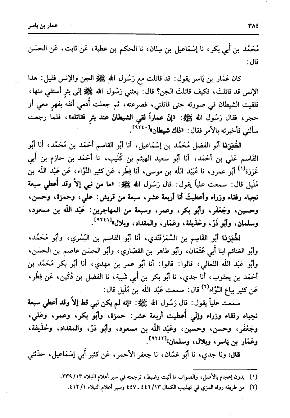[9240] أخبرنا أبو الفضل محمد بن إسماعيل أنا أبو القاسم أحمد بن محمد أنا أبو القاسم علي بن أحمد أنا أبو سعيد الهيثم بن كليب نا أحمد بن حازم بن أبي غرزة (1) أبو عمرو نا عبيد الله بن موسى أنا فطر عن كثير النواء عن عبد الله بن مليل قال سمعت عليا يقول قال رسول الله (صلى الله عليه وسلم) ما من نبي إلا وقد أعطي سبع نجباء رفقاء وزراء وأعطيت أنا أربعة عشر سبعة من قريش علي وحمزة وحسن وحسين وجعفر وأبو بكر وعمر وسبعة من المهاجرين عبد الله بن مسعود وسلمان وأبو ذر وحذيفة وعمار والمقداد وبلال
