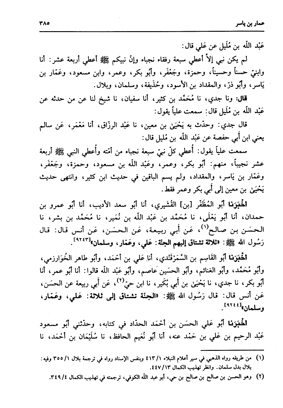 عبد الله بن مليل عن علي قال لم يكن نبي إلا أعطي سبعة رفقاء نجباء وإن نبيكم (صلى الله عليه وسلم) أعطي أربعة عشر أنا وابني حسنا وحسينا وحمزة وجعفر وأبو بكر وعمر وابن مسعود وعمار بن ياسر وأبو ذر والمقداد بن الأسود وحذيفة وسلمان وبلال قال ونا جدي نا محمد بن كثير أنا سفيان نا شيخ لنا عن من حدثه عن عبد الله بن مليل قال سمعت عليا يقول قال جدي وحدث به يحيى بن معين نا عبد الرزاق أنا معمر عن سالم يعني ابن أبي حفصة عن عبد الله بن مليل قال سمعت عليا يقول أعطي كل نبي سبعة نجباء من أمته وأعطي النبي (صلى الله عليه وسلم) أربعة عشر نجيبا منهم أبو بكر وعمر وعبد الله بن مسعود وحمزة وجعفر وعمار بن ياسر والمقداد ولم يسم الباقين في حديث ابن كثير وانتهى حديث يحيى بن معين إلى أبي بكر وعمر فقط أخبرنا أبو المظفر بن القشيري أنا أبو سعد الأديب أنا أبو عمرو بن حمدان أنا أبو يعلى نا محمد بن عبد الله بن نمير نا محمد بن بشر نا الحسن بن صالح (1) عن أبي ربيعة عن الحسن عن أنس قال قال رسول الله (صلى الله عليه وسلم) ثلاثة تشتاق إليهم الجنة علي وعمار وسلمان