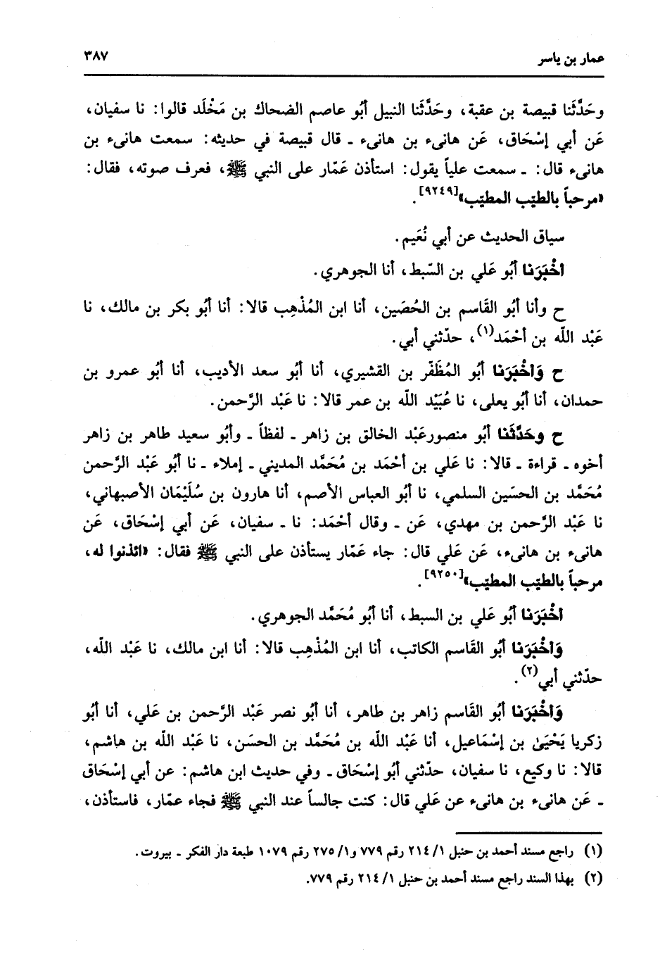[9249] سياق الحديث عن أبي نعيم أخبرنا أبو علي بن السبط أنا الجوهري ح وأنا أبو القاسم بن الحصين أنا ابن المذهب قالا أنا أبو بكر بن مالك نا عبد الله بن أحمد (1) حدثني أبي ح وأخبرنا أبو المظفر بن القشيري أنا أبو سعد الأديب أنا أبو عمرو بن حمدان أنا أبو يعلى نا عبيد الله بن عمر قالا نا عبد الرحمن ح وحدثنا أبو منصور عبد الخالق بن زاهر لفظا وأبو سعيد طاهر بن زاهر أخوه قراءة قالا نا علي بن أحمد بن محمد المديني إملاء نا أبو عبد الرحمن محمد بن الحسين السلمي نا أبو العباس الأصم أنا هارون بن سليمان الأصبهاني نا عبد الرحمن بن مهدي عن وقال أحمد نا سفيان عن أبي إسحاق عن هانئ بن هانئ عن علي قال جاء عمار يستأذن على النبي (صلى الله عليه وسلم) فقال ائذنوا له مرحبا بالطيب المطيب