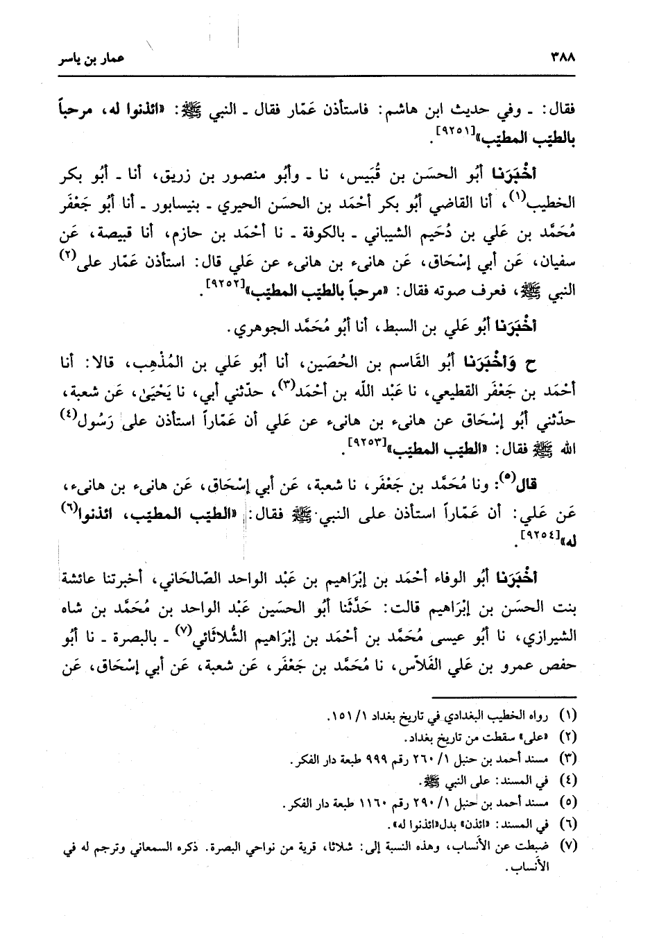 [9252] أخبرنا أبو علي بن السبط أنا أبو محمد الجوهري ح وأخبرنا أبو القاسم بن الحصين أنا أبو علي بن المذهب قالا أنا أحمد بن جعفر القطيعي نا عبد الله بن أحمد (3) حدثني أبي نا يحيى عن شعبة حدثني أبو إسحاق عن هانئ بن هانئ عن علي أن عمارا استأذن على رسول (4) الله (صلى الله عليه وسلم) فقال الطيب المطيب