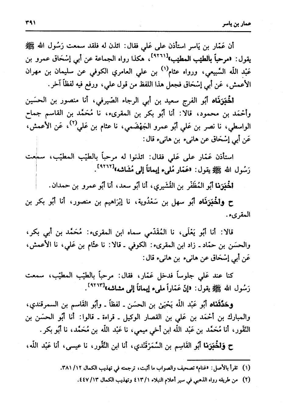 [9262] أخبرنا أبو المظفر بن القشيري أنا أبو سعد أنا أبو عمرو بن حمدان ح وأخبرناه أبو سهل بن سعدوية نا إبراهيم بن منصور أنا أبو بكر بن المقرئ قالا أنا أبو يعلى نا المقدمي سماه ابن المقرئ محمد بن أبي بكر والحسن بن حماد زاد ابن المقرئ الكوفي قالا نا عثام بن علي نا الأعمش عن أبي إسحاق عن هانئ بن هانئ قال كنا عند علي جلوسا فدخل عمار فقال مرحبا بالطيب المطيب سمعت رسول الله (صلى الله عليه وسلم) يقول إن عمارا ملئ إيمانا إلى مشاشه