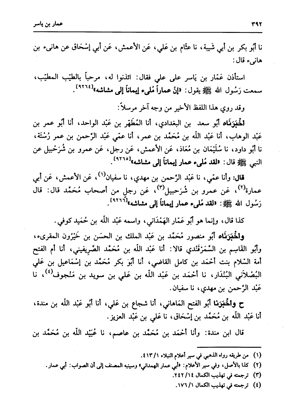 نا أبو بكر بن أبي شيبة نا عثام بن علي عن الأعمش عن أبي إسحاق عن هانئ بن هانئ قال استأذن عمار بن ياسر على علي فقال ائذنوا له مرحبا بالطيب المطيب سمعت رسول الله (صلى الله عليه وسلم) يقول إن عمارا ملئ إيمانا إلى مشاشه