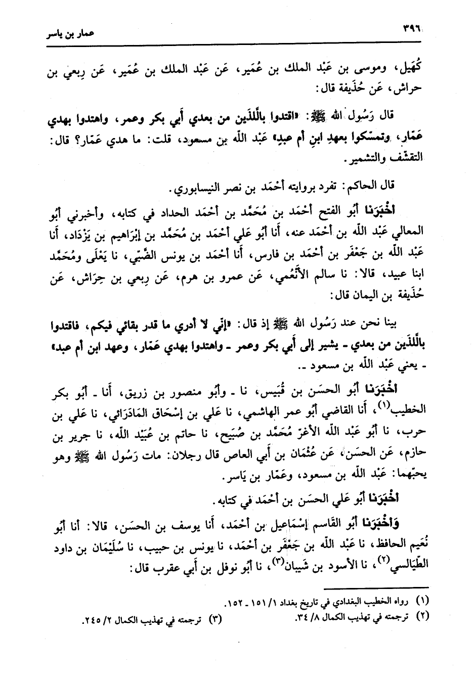 كهيل وموسى بن عبد الملك بن عمير عن عبد الملك بن عمير عن ربعي بن حراش عن حذيفة قال قال رسول الله (صلى الله عليه وسلم) اقتدوا باللذين من بعدي أبي بكر واهتدوا بهدي عمار وتمسكوا بعهد ابن أم عبد عبد الله بن مسعود قلت ما هدي عمار قال التقشف والتشمير قال الحاكم تفرد بروايته أحمد بن نصر النيسابوري أخبرنا أبو الفتح أحمد بن محمد بن أحمد الحداد في كتابه وأخبرني أبو المعالي عبد الله بن أحمد عنه أنا أبو علي أحمد بن محمد بن إبراهيم بن يزداد أنا عبد الله بن جعفر بن أحمد بن فارس أنا أحمد بن يونس الضبي نا يعلى ومحمد ابنا عبيد قالا نا سالم الأنعمي عن عمرو بن هرم عن ربعي بن حراش عن حذيفة بن اليمان قال بينا نحن عند رسول الله (صلى الله عليه وسلم) إذ قال إني لا أدري ما قدر بقائي فيكم فاقتدوا باللذين من بعدي يشير إلى أبي بكر وعمر واهتدوا بهدي عمار وعهد ابن أم عبد يعني عبد الله بن مسعود أخبرنا أبو الحسن بن قبيس نا وأبو منصور بن زريق أنا أبو بكر الخطيب (1) أنا القاضي أبو عمر الهاشمي نا علي بن إسحاق المادرائي نا علي بن حرب نا أبو عبد الله الأغر محمد بن صبيح نا حاتم بن عبيد الله نا جرير بن حازم عن الحسن عن عثمان بن أبي العاص قال رجلان مات رسول الله (صلى الله عليه وسلم) وهو يحبهما عبد الله بن مسعود وعمار بن ياسر أخبرنا أبو علي الحسن بن أحمد في كتابه وأخبرنا أبو القاسم إسماعيل بن أحمد أنا يوسف بن الحسن قالا أنا أبو نعيم الحافظ نا عبد الله بن جعفر بن أحمد نا يونس بن حبيب نا سليمان بن داود الطيالسي (2) نا الأسود بن شيبان (3) نا أبو نوفل بن أبي عقرب قال
