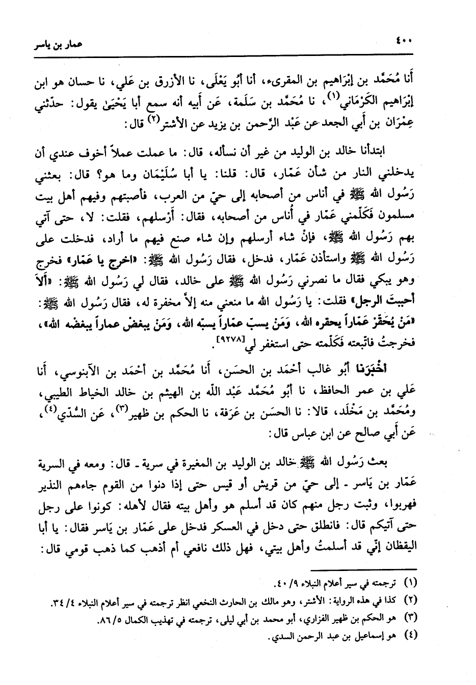 أنا محمد بن إبراهيم بن المقرئ أنا أبو يعلى نا الأزرق بن علي نا حسان هو ابن إبراهيم الكرماني (1) نا محمد بن سلمة عن أبيه أنه سمع أبا يحيى يقول حدثني عمران بن أبي الجعد عن عبد الرحمن بن يزيد عن الأشتر (2) قال ابتدأنا خالد بن الوليد من غير أن نسأله قال ما عملت عملا أخوف عندي أن يدخلني النار من شأن عمار قال قلنا يا أبا سليمان وما هو قال بعثني رسول الله (صلى الله عليه وسلم) في أناس من أصحابه إلى حي من العرب فأصبتهم وفيهم أهل بيت مسلمون فكلمني عمار في أناس من أصحابه فقال أرسلهم فقلت لا حتى آتي بهم رسول الله (صلى الله عليه وسلم) فإن شاء أرسلهم وإن شاء صنع فيهم ما أراد فدخلت على رسول الله (صلى الله عليه وسلم) واستأذن عمار فدخل فقال رسول الله (صلى الله عليه وسلم) اخرج يا عمار فخرج وهو يبكي فقال ما نصرني رسول الله (صلى الله عليه وسلم) على خالد فقال لي رسول الله (صلى الله عليه وسلم) ألا أحببت الرجل فقلت يا رسول الله ما منعني منه إلا مخفرة له فقال رسول الله (صلى الله عليه وسلم) من يحقر عمارا يحقره الله ومن يسب عمارا يسبه الله ومن يبغض عمارا يبغضه الله فخرجت فاتبعته فكلمته حتى استغفر لي
