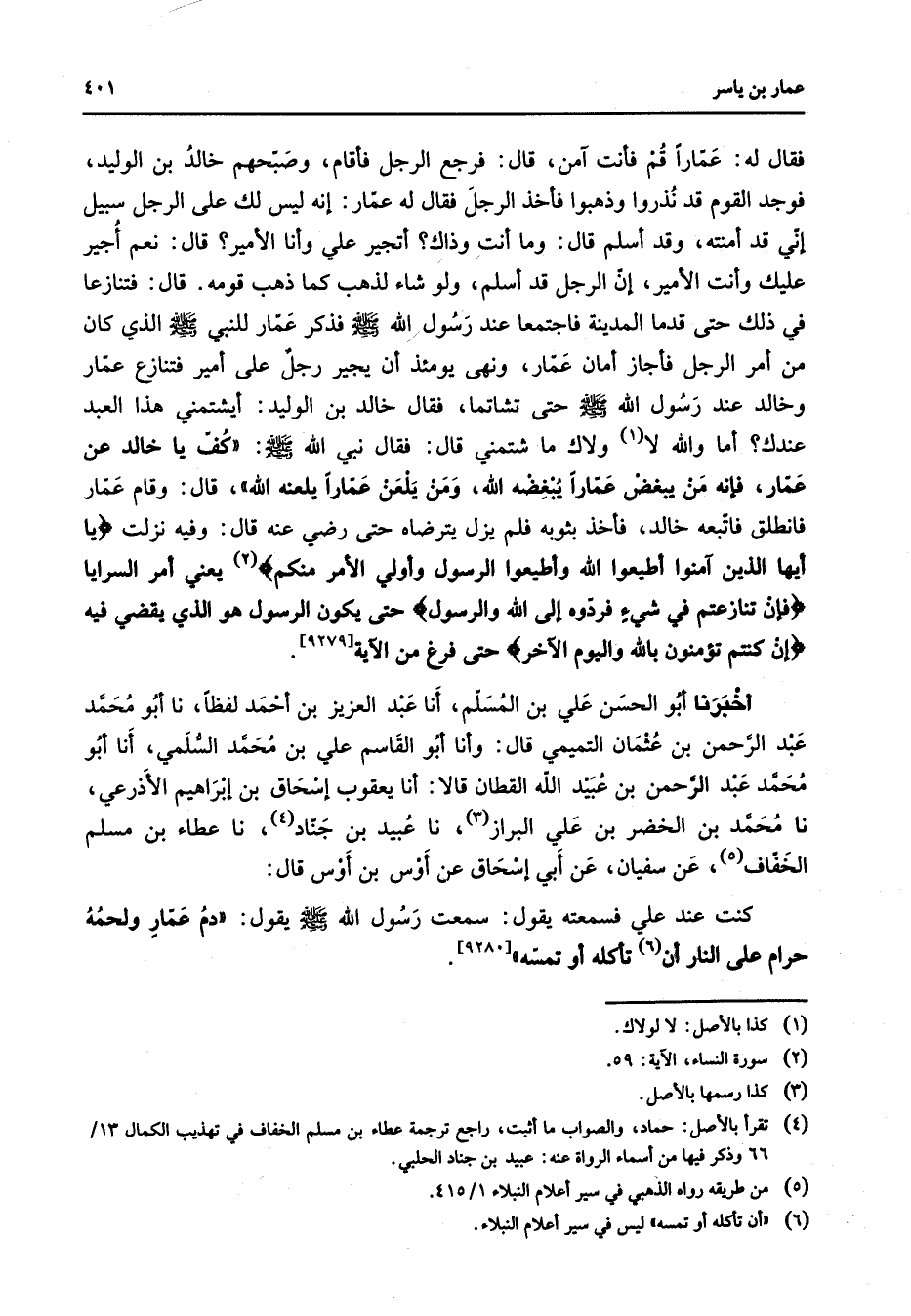 فقال له عمارا قم فأنت آمن قال فرجع الرجل فأقام وصبحهم خالد بن الوليد فوجد القوم قد نذروا وذهبوا فأخذ الرجل فقال له عمار إنه ليس لك على الرجل سبيل إني قد أمنته وقد أسلم قال وما أنت وذاك أتجير علي وأنا الأمير قال نعم أجير عليك وأنت الأمير إن الرجل قد أسلم ولو شاء لذهب كما ذهب قومه قال فتنازعا في ذلك حتى قدما المدينة فاجتمعا عند رسول الله (صلى الله عليه وسلم) فذكر عمار للنبي (صلى الله عليه وسلم) الذي كان من أمر الرجل فأجاز أمان عمار ونهى يومئذ أن يجير رجل على أمير فتنازع عمار وخالد عند رسول الله (صلى الله عليه وسلم) حتى تشاتما فقال خالد بن الوليد أيشتمني هذا العبد عندك أما والله لا (1) ولاك ما شتمني قال فقال نبي الله (صلى الله عليه وسلم) كف يا خالد عن عمار فإنه من يبغض عمارا يبغضه الله ومن يلعن عمارا يلعنه الله قال وقام عمار فانطلق فاتبعه خالد فأخذ بثوبه فلم يزل يترضاه حتى رضي عنه قال وفيه نزلت " يا أيها الذين آمنوا أطيعوا الله وأطيعوا الرسول وأولي الأمر منكم " (2) يعني أمر السرايا " فإن تنازعتم في شئ فردوه إلى الله والرسول " حتى يكون الرسول هو الذي يقضي فيه " إن كنتم تؤمنون بالله واليوم الآخر " حتى فرغ من الآية