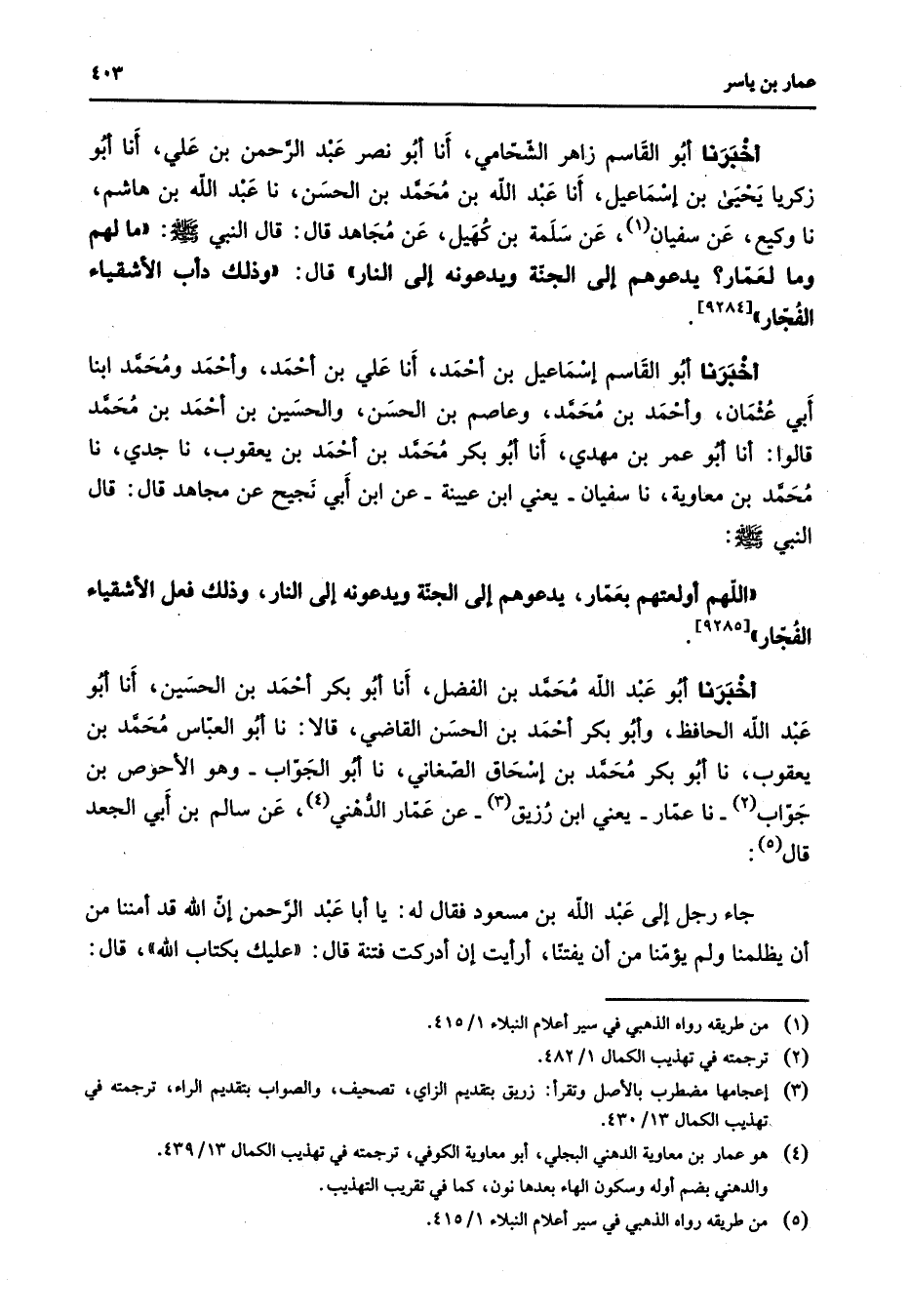 أخبرنا أبو القاسم زاهر الشحامي أنا أبو نصر عبد الرحمن بن علي أنا أبو زكريا يحيى بن إسماعيل أنا عبد الله بن محمد بن الحسن نا عبد الله بن هاشم نا وكيع عن سفيان (1) عن سلمة بن كهيل عن مجاهد قال قال النبي (صلى الله عليه وسلم) ما لهم وما لعمار يدعوهم إلى الجنة ويدعونه إلى النار قال وذلك دأب الأشقياء الفجار