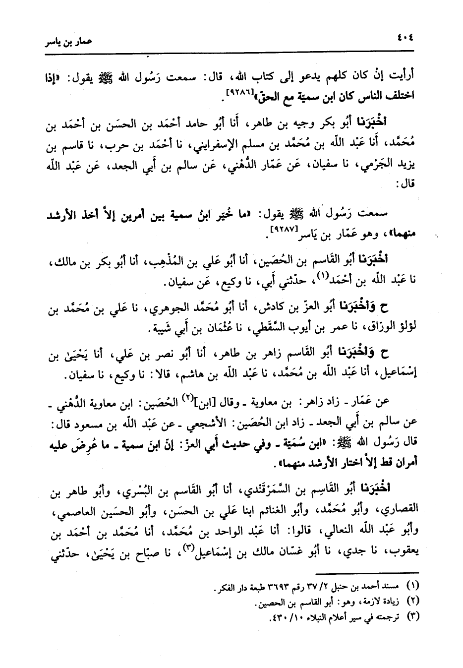 [9287] أخبرنا أبو القاسم بن الحصين أنا أبو علي بن المذهب أنا أبو بكر بن مالك نا عبد الله بن أحمد (1) حدثني أبي نا وكيع عن سفيان ح وأخبرنا أبو العز بن كادش أنا أبو محمد الجوهري نا علي بن محمد بن لؤلؤ الوراق نا عمر بن أيوب السقطي نا عثمان بن أبي شيبة ح وأخبرنا أبو القاسم زاهر بن طاهر أنا أبو نصر بن علي أنا يحيى بن إسماعيل أنا عبد الله بن محمد نا عبد الله بن هاشم قالا نا وكيع نا سفيان عن عمار زاد زاهر بن معاوية وقال ابن (2) الحصين ابن معاوية الدهني عن سالم بن أبي الجعد زاد ابن الحصين الأشجعي عن عبد الله بن مسعود قال قال رسول الله (صلى الله عليه وسلم) ابن سمية وفي حديث أبي العز إن ابن سمية ما عرض عليه أمران قط إلا اختار الأرشد منهما أخبرنا أبو القاسم بن السمرقندي أنا أبو القاسم بن البسري وأبو طاهر بن القصاري وأبو محمد وأبو الغنائم ابنا علي بن الحسن وأبو الحسين العاصمي وأبو عبد الله النعالي قالوا أنا عبد الواحد بن محمد أنا محمد بن أحمد بن يعقوب نا جدي نا أبو غسان مالك بن إسماعيل (3) نا صباح بن يحيى حدثني