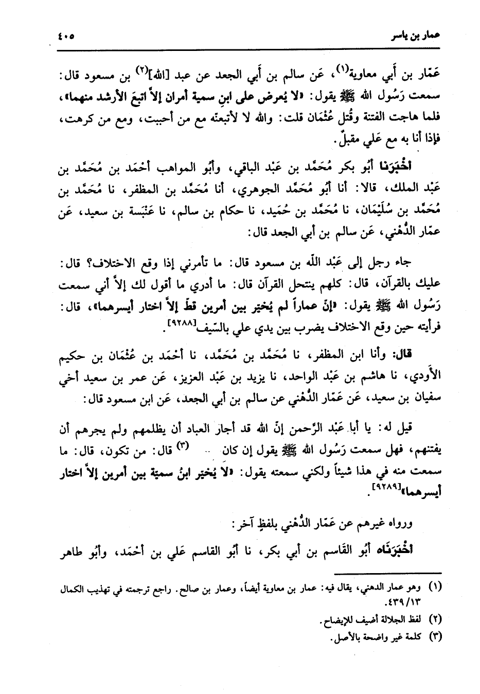 عمار بن أبي معاوية (1) عن سالم بن أبي الجعد عن عبد الله (2) بن مسعود قال سمعت رسول الله (صلى الله عليه وسلم) يقول لا يعرض على ابن سمية أمران إلا اتبع الأرشد منهما فلما هاجت الفتنة وقتل عثمان قلت والله لا لأتبعنه مع من أحببت ومع من كرهت فإذا أنا به مع علي مقبل أخبرنا أبو بكر محمد بن عبد الباقي وأبو المواهب أحمد بن محمد بن عبد الملك قالا أنا أبو محمد الجوهري أنا محمد بن المظفر نا محمد بن محمد بن سليمان نا محمد بن حميد نا حكام بن سالم نا عنبسة بن سعيد عن عمار الدهني عن سالم بن أبي الجعد قال جاء رجل إلى عبد الله بن مسعود قال ما تأمرني إذا وقع الإختلاف قال عليك بالقرآن قال كلهم ينتحل القرآن قال ما أدري ما أقول لك إلا أني سمعت رسول الله (صلى الله عليه وسلم) يقول إن عمارا لم يخير بين أمرين قط إلا اختار أيسرهما قال فرأيته حين وقع الإختلاف يضرب بين يدي علي بالسيف