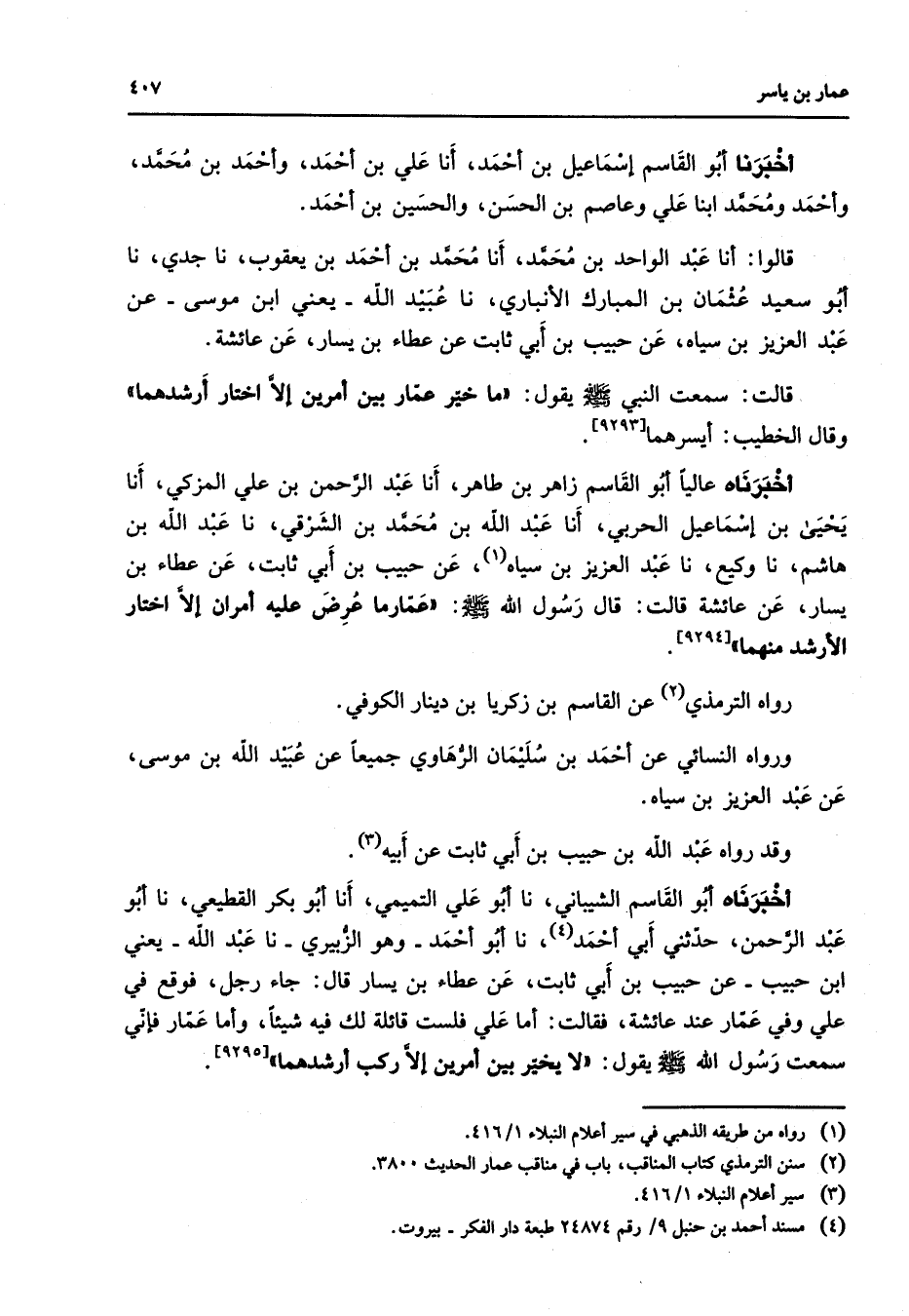 [9294] رواه الترمذي (2) عن القاسم بن زكريا بن دينار الكوفي ورواه النسائي عن أحمد بن سليمان الرهاوي جميعا عن عبيد الله بن موسى عن عبد العزيز بن سياه وقد رواه عبد الله بن حبيب بن أبي ثابت عن أبيه (3) أخبرناه أبو القاسم الشيباني نا أبو علي التميمي أنا أبو بكر القطيعي نا أبو عبد الرحمن حدثني أبي أحمد (4) نا أبو أحمد وهو الزبيري نا عبد الله يعني ابن حبيب عن حبيب بن أبي ثابت عن عطاء بن يسار قال جاء رجل فوقع في علي وفي عمار عند عائشة فقالت أما علي فلست قائلة لك فيه شيئا وأما عمار فإني سمعت رسول الله (صلى الله عليه وسلم) يقول لا يخير بين أمرين إلا ركب أرشدهما