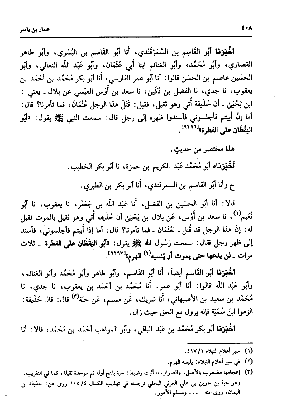 أخبرنا أبو القاسم بن السمرقندي أنا أبو القاسم بن البسري وأبو طاهر القصاري وأبو محمد وأبو الغنائم ابنا أبي عثمان وأبو عبد الله النعالي وأبو الحسين عاصم بن الحسن قالوا أنا أبو عمر الفارسي أنا أبو بكر محمد بن أحمد بن يعقوب نا جدي نا الفضل بن دكين نا سعد بن أوس العبسي عن بلال يعني ابن يحيى أن حذيفة أتي وهو ثقيل فقيل قتل هذا الرجل عثمان فما تأمرنا قال أما إن أبيتم فأجلسوني فأسندوا ظهره إلى رجل قال سمعت النبي (صلى الله عليه وسلم) يقول أبو اليقظان على الفطرة