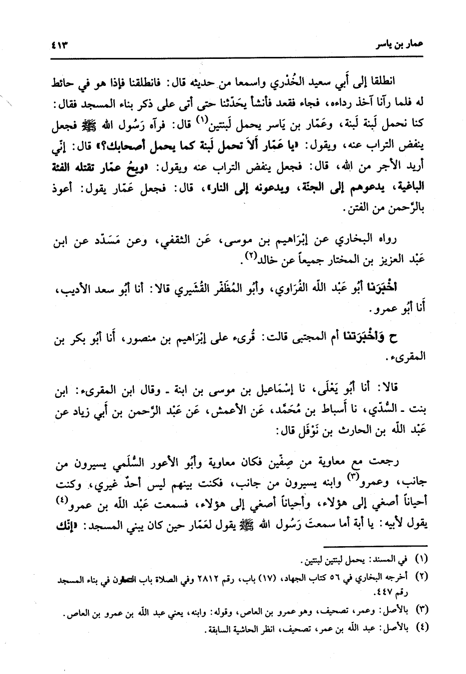 انطلقا إلى أبي سعيد الخدري واسمعا من حديثه قال فانطلقنا فإذا هو في حائط له فلما رآنا آخذ رداءه فجاء فقعد فأنشأ يحدثنا حتى أتى على ذكر بناء المسجد فقال كنا نحمل لبنة لبنة وعمار بن ياسر يحمل لبنتين (1) قال فرآه رسول الله (صلى الله عليه وسلم) فجعل ينفض التراب عنه ويقول يا عمار ألا تحمل لبنة كما يحمل أصحابك قال إني أريد الأجر من الله قال فجعل ينفض التراب عنه ويقول ويح عمار تقتله الفئة الباغية يدعوهم إلى الجنة ويدعونه إلى النار قال فجعل عمار يقول أعوذ بالرحمن من الفتن رواه البخاري عن إبراهيم بن موسى عن الثقفي وعن مسدد عن ابن عبد العزيز بن المختار جميعا عن خالد (2) أخبرنا أبو عبد الله الفراوي وأبو المظفر القشيري قالا أنا أبو سعد الأديب أنا أبو عمرو ح وأخبرتنا أم المجتبى قالت قرئ على إبراهيم بن منصور أنا أبو بكر بن المقرئ قالا أنا أبو يعلى نا إسماعيل بن موسى بن ابنة وقال ابن المقرئ ابن بنت السدي نا أسباط بن محمد عن الأعمش عن عبد الرحمن بن أبي زياد عن عبد الله بن الحارث بن نوفل قال رجعت مع معاوية من صفين فكان معاوية وأبو الأعور السلمي يسيرون من جانب وعمرو (3) وابنه يسيرون من جانب فكنت بينهم ليس أحد غيري وكنت أحيانا أصغي إلى هؤلاء وأحيانا أصغي إلى هؤلاء فسمعت عبد الله بن عمرو (4) يقول لأبيه يا أبة أما سمعت رسول الله (صلى الله عليه وسلم) يقول لعمار حين كان يبني المسجد إنك