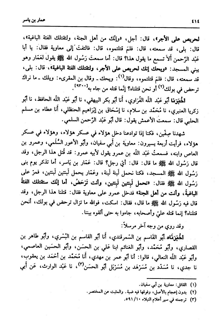 [9300] أخبرنا أبو عبد الله الفراوي أنا أبو بكر البيهقي نا أبو عبد الله الحافظ نا أبو زكريا العنبري نا محمد بن سلام نا إسحاق بن إبراهيم الحنظلي أنا عطاء بن مسلم الحلبي قال سمعت الأعمش يقول قال أبو عبد الرحمن السلمي شهدنا صفين فكنا إذا توادعنا دخل هؤلاء في عسكر هؤلاء وهؤلاء في عسكر هؤلاء فرأيت أربعة يسيرون معاوية بن أبي سفيان وأبو الأعور السلمي وعمرو بن العاص وابنه فسمعت عبد الله بن عمرو يقول لأبيه عمرو قد قتل هذا الرجل وقد قال رسول الله (صلى الله عليه وسلم) ما قال قال أي رجل قال عمار بن ياسر أما تذكر يوم بنى رسول الله (صلى الله عليه وسلم) المسجد فكنا نحمل لبنة لبنة وعمار يحمل لبنتين لبنتين فمر على رسول الله (صلى الله عليه وسلم) فقال تحمل لبنتين لبنتين وأنت ترحض أما إنك ستقتلك الفئة الباغية وأنت من أهل الجنة فدخل عمرو على معاوية فقال قتلنا هذا الرجل وقد قال فيه رسول الله (صلى الله عليه وسلم) ما قال فقال اسكت فوالله ما تزال ترحض في بولك أنحن قتلناه إنما قتله علي وأصحابه جاءوا به حتى ألقوه بيننا وقد روي من وجه آخر مرسلا أخبرناه أبو القاسم بن السمرقندي أنا أبو القاسم بن البسري وأبو طاهر بن القصاري وأبو محمد وأبو الغنائم ابنا علي بن الحسن وأبو الحسين العاصمي وأبو عبد الله النعالي قالوا أنا أبو عمر بن مهدي أنا محمد بن أحمد بن يعقوب نا جدي نا مسدد بن مسرهد بن مسربل أبو الحسن (3) نا عبد الوارث عن أبي