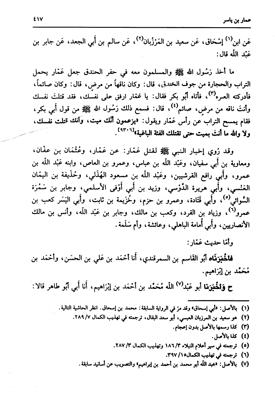 عن ابن (1) إسحاق عن سعيد بن المرزبان (2) عن سالم بن أبي الجعد عن جابر بن عبد الله قال ما أخذ رسول الله (صلى الله عليه وسلم) والمسلمون معه في حفر الخندق جعل عمار يحمل التراب والحجارة من جوف الخندق قال وكان ناقها من مرض قال وكان صائما فأدركته العترة (3) فأتاه أبو بكر فقال يا عمار ارفق على نفسك فقد قتلت نفسك وأنت ناقه من مرض صائم (4) قال فسمع ذلك رسول الله (صلى الله عليه وسلم) من قول أبي بكر فقام يمسح التراب عن رأس عمار ويقول يزعمون أنك ميت وأنك قتلت نفسك ولا والله ما أنت بميت حتى تقتلك الفئة الباغية