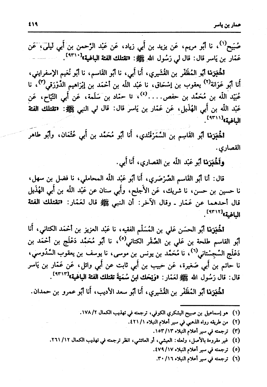 [9312] أخبرنا أبو الحسن علي بن المسلم الفقيه نا عبد العزيز بن أحمد الكتاني أنا أبو القاسم طلحة بن علي بن الصقر الكتاني (5) نا أبو محمد دعلج بن أحمد بن دعلج السجستاني (6) نا محمد بن يونس بن موسى نا يوسف بن يعقوب السدوسي نا حاتم بن أبي صغيرة عن حبيب بن أبي ثابت عن أبي وائل عن عمار بن ياسر قال قال رسول الله (صلى الله عليه وسلم) لعمار ويحك ابن سمية تقتلك الفئة الباغية