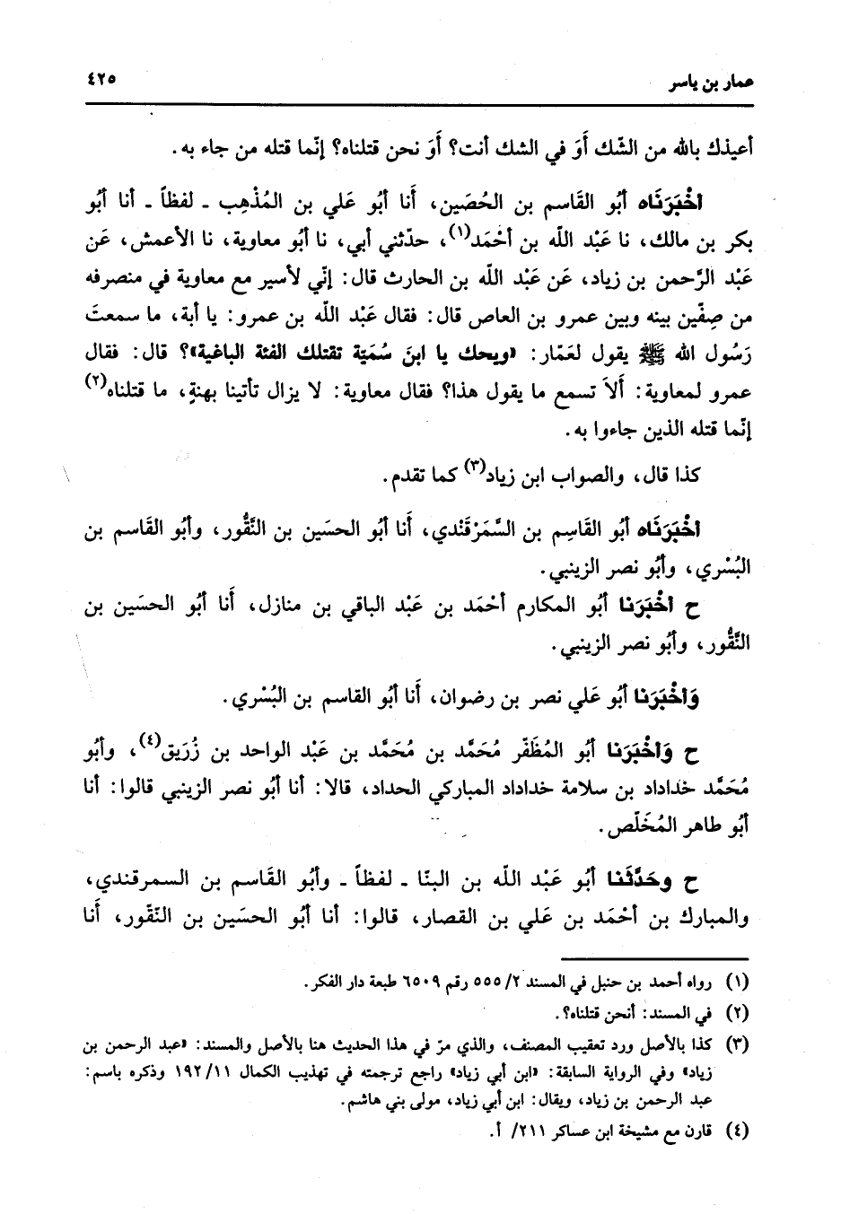 أعيذك بالله من الشك أو في الشك أنت أو نحن قتلناه إنما قتله من جاء به أخبرناه أبو القاسم بن الحصين أنا أبو علي بن المذهب لفظا أنا أبو بكر بن مالك نا عبد الله بن أحمد (1) حدثني أبي نا أبو معاوية نا الأعمش عن عبد الرحمن بن زياد عن عبد الله بن الحارث قال إني لأسير مع معاوية في منصرفه من صفين بينه وبين عمرو بن العاص قال فقال عبد الله بن عمرو يا أبة ما سمعت رسول الله (صلى الله عليه وسلم) يقول لعمار ويحك يا ابن سمية تقتلك الفئة الباغية قال فقال عمرو لمعاوية ألا تسمع ما يقول هذا فقال معاوية لا يزال تأتينا بهنة ما قتلناه (2) إنما قتله الذين جاءوا به كذا قال والصواب ابن زياد (3) كما تقدم أخبرناه أبو القاسم بن السمرقندي أنا أبو الحسين بن النقور وأبو القاسم بن البسري وأبو نصر الزينبي ح أخبرنا أبو المكارم أحمد بن عبد الباقي بن منازل أنا أبو الحسين بن النقور وأبو نصر الزينبي وأخبرنا أبو علي نصر بن رضوان أنا أبو القاسم البسري ح وأخبرنا أبو المظفر محمد بن محمد بن عبد الواحد بن زريق (4) وأبو محمد خداداد بن سلامة خداداد المباركي الحداد قالا أنا أبو نصر الزينبي قالوا أنا أبو طاهر المخلص ح وحدثنا أبو عبد الله بن البنا لفظا وأبو القاسم بن السمرقندي والمبارك بن أحمد بن علي بن القصار قالوا أنا أبو الحسين بن النقور أنا