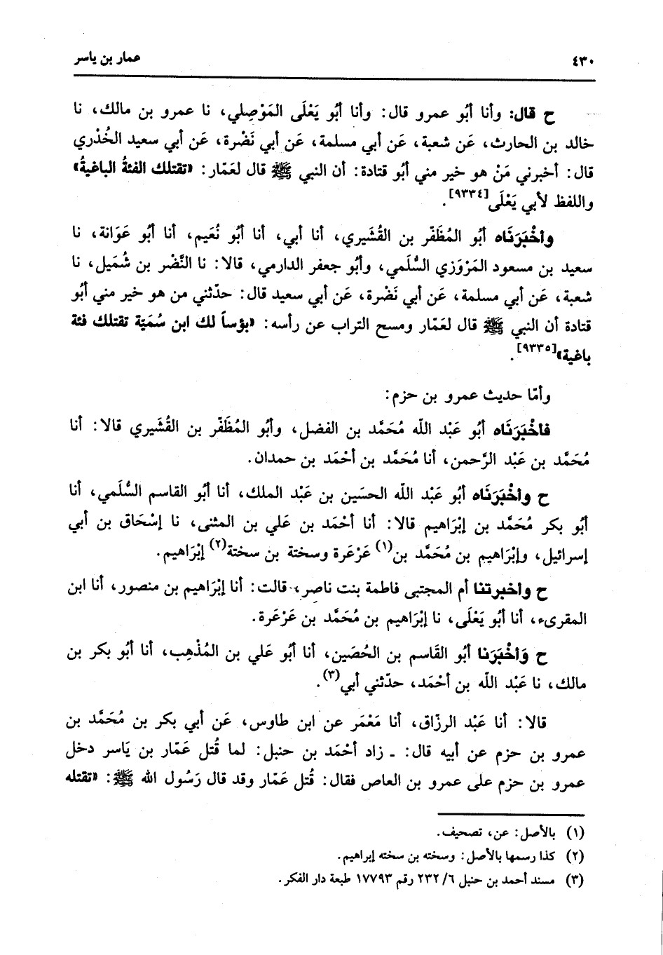 [9335] وأما حديث عمرو بن حزم فأخبرناه أبو عبد الله محمد بن الفضل وأبو المظفر بن القشيري قالا أنا محمد بن عبد الرحمن أنا محمد بن أحمد بن حمدان ح وأخبرناه أبو عبد الله الحسين بن عبد الملك أنا أبو القاسم السلمي أنا أبو بكر محمد بن إبراهيم قالا أنا أحمد بن علي بن المثنى نا إسحاق بن أبي إسرائيل وإبراهيم بن محمد (1) بن عرعرة وسختة بن سختة (2) إبراهيم ح وأخبرتنا أم المجتبى فاطمة بنت ناصر قالت أنا إبراهيم بن منصور أنا ابن المقرئ أنا أبو يعلى نا إبراهيم بن محمد بن عرعرة ح وأخبرنا أبو القاسم بن الحصين أنا أبو علي بن المذهب أنا أبو بكر بن مالك نا عبد الله بن أحمد حدثني أبي (3) قالا أنا عبد الرزاق أنا معمر عن ابن طاوس عن أبي بكر بن محمد بن عمرو بن حزم عن أبيه قال زاد أحمد بن حنبل لما قتل عمار بن ياسر دخل عمرو بن حزم على عمرو بن العاص فقال قتل عمار وقد قال رسول الله (صلى الله عليه وسلم) تقتله