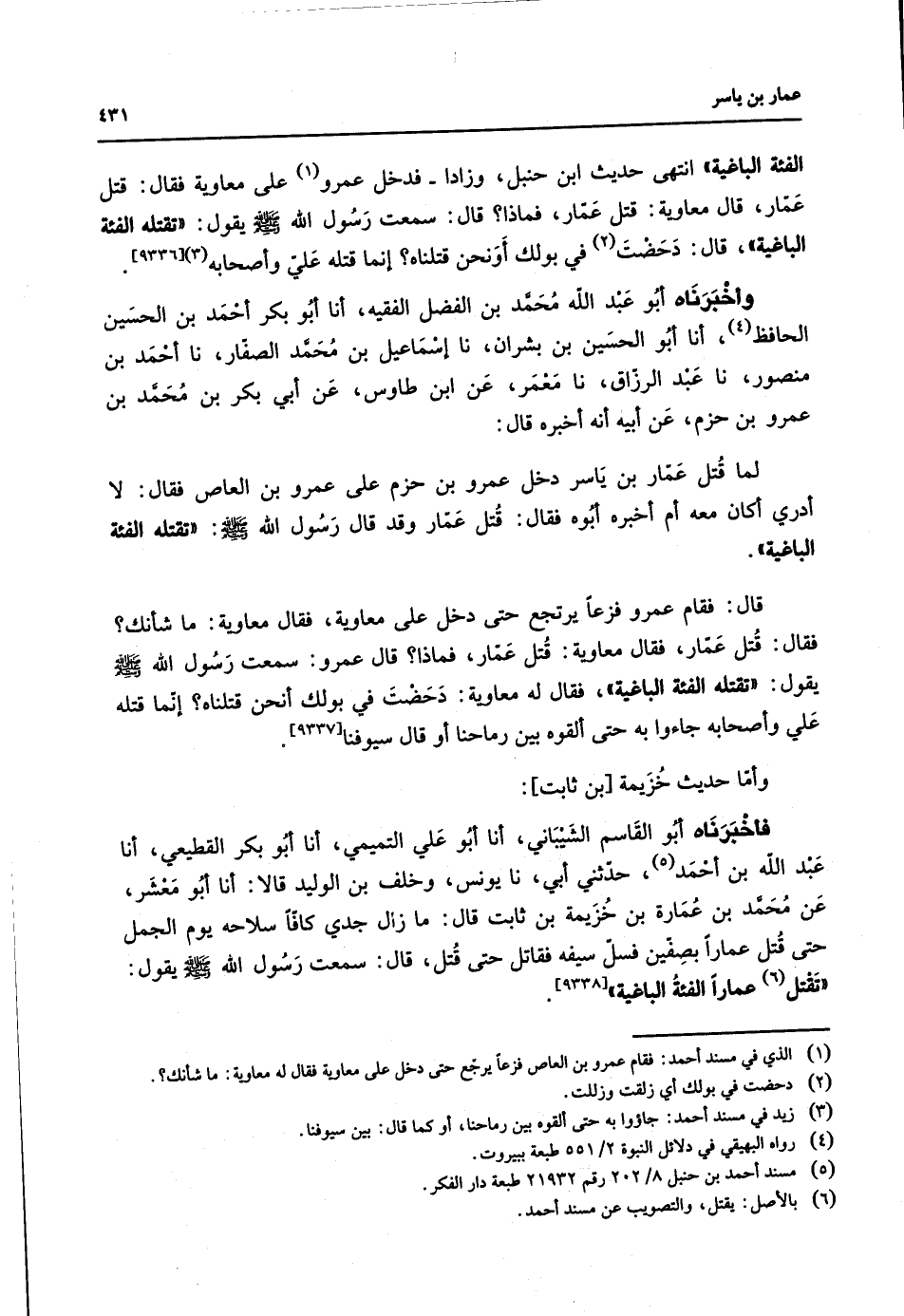 عن محمد بن عمارة بن خزيمة بن ثابت قال ما زال جدي كافا سلاحه يوم الجمل حتى قتل عمارا بصفين فسل سيفه فقاتل حتى قتل قال سمعت رسول الله (صلى الله عليه وسلم) يقول تقتل (6) عمارا الفئة الباغية