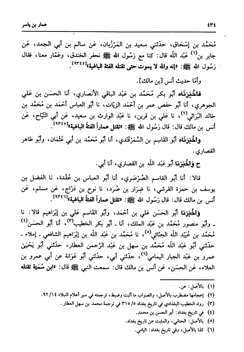 [9346] وأخبرنا أبو الحسن علي بن أحمد وأبو القاسم علي بن إبراهيم قالا نا وأبو منصور محمد بن عبد الملك أنا أبو بكر الخطيب (3) أنا أبو الحسن (4) محمد بن عبيد الله الحنائي (5) نا محمد بن عبد الله بن إبراهيم الشافعي إملاء حدثني أبو عبد الله محمد بن سهل بن عبد الرحمن العطار حدثني أبو يحيى عمرو بن عبد الجبار اليمامي (6) حدثني أبي حدثني أبو عوانة عن أبي عمرو بن العلاء عن الحسن عن أنس بن مالك قال سمعت النبي (صلى الله عليه وسلم) قال ابن سمية تقتله