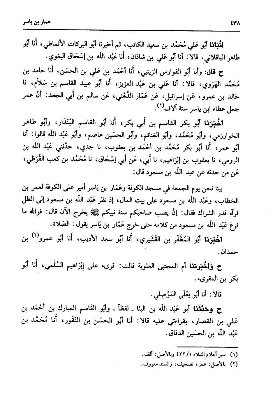 أنبأنا أبو علي محمد بن سعيد الكاتب ثم أخبرنا أبو البركات الأنماطي أنا أبو طاهر الباقلاني قالا أنا أبو علي بن شاذان أنا عبد الله بن إسحاق البغوي ح قال وأنا أبو الفوارس الزينبي أنا أحمد بن علي بن الحسن أنا حامد بن محمد الهروي قالا أنا علي بن عبد العزيز أنا أبو عبيد القاسم بن سلام نا خالد بن عمرو عن إسرائيل عن عمار الدهني عن سالم بن أبي الجعد أن عمر جعل عطاء ابن ياسر ستة آلاف (1) أخبرنا أبو بكر القاسم بن أبي بكر أنا أبو القاسم البندار وأبو طاهر الخوارزمي وأبو محمد وأبو الغنائم وأبو الحسين عاصم وأبو عبد الله قالوا أنا أبو عمر أنا أبو بكر محمد بن أحمد بن يعقوب نا جدي حدثني عبد الله بن الرومي نا يعقوب بن إبراهيم نا أبي عن أبي إسحاق نا محمد بن كعب القرظي عن من حدثه عن عبد الله بن مسعود قال بينا نحن يوم الجمعة في مسجد الكوفة وعمار بن ياسر أمير على الكوفة لعمر بن الخطاب وعبد الله بن مسعود على بيت المال إذ نظر عبد الله بن مسعود إلى الظل فرآه قدر الشراك فقال إن يصب صاحبكم سنة نبيكم (صلى الله عليه وسلم) يخرج الآن قال فوالله ما فرغ عبد الله بن مسعود من كلامه حتى خرج عمار بن ياسر يقول الصلاة أخبرنا أبو المظفر بن القشيري أنا أبو سعد الأديب أنا أبو عمرو (2) بن حمدان ح وأخبرتنا أم المجتبى العلوية قالت قرئ على إبراهيم السلمي أنا أبو بكر بن المقرئ قالا أنا أبو يعلى الموصلي ح وحدثنا أبو عبد الله بن البنا لفظا وأبو القاسم المبارك بن أحمد بن علي بن القصار بقراءتي عليه قالا أنا أبو الحسن بن النقور أنا محمد بن عبد الله بن الحسين الدقاق