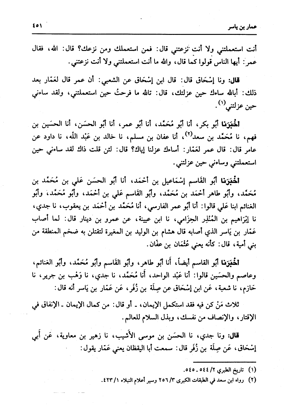 أنت استعملتني ولا أنت نزعتني قال فمن استعملك ومن نزعك قال الله فقال عمر أيها الناس قولوا كما قال والله ما أنت استعملتني ولا أنت نزعتني قال ونا إسحاق قال قال ابن إسحاق عن الشعبي أن عمر قال لعمار بعد ذلك أبالله ساءك حين عزلتك قال تالله ما فرحت حين استعملتني ولقد ساءني حين عزلتني (1) أخبرنا أبو بكر أنا أبو محمد أنا أبو عمر أنا أبو الحسن أنا الحسين بن فهم نا محمد بن سعد (2) أنا عفان بن مسلم نا خالد بن عبد الله نا داود عن عامر قال قال عمر لعمار أساءك عزلنا إياك قال لئن قلت ذاك لقد ساءني حين استعملتني وساءني حين عزلتني أخبرنا أبو القاسم إسماعيل بن أحمد أنا أبو الحسن علي بن محمد بن محمد وأبو طاهر أحمد بن محمد وأبو القاسم علي بن أحمد وأبو محمد وأبو الغنائم ابنا علي قالوا أنا أبو عمر الفارسي أنا محمد بن أحمد بن يعقوب نا جدي نا إبراهيم بن المنذر الحزامي نا ابن عيينة عن عمرو بن دينار قال لما أصاب عمار بن ياسر الذي أصابه قال هشام بن الوليد بن المغيرة لتقتلن به ضخم المنطقة من بني أمية قال كأنه يعني عثمان بن عفان أخبرنا أبو القاسم أيضا أنا أبو طاهر وأبو القاسم وأبو محمد وأبو الغنائم وعاصم والحسين قالوا أنا عبد الواحد أنا محمد نا جدي نا وهب بن جرير نا حازم نا شعبة عن ابن إسحاق عن صلة بن زفر عن عمار بن ياسر أنه قال ثلاث من كن فيه فقد استكمل الإيمان أو قال من كمال الإيمان الإنفاق في الإقتار والإنصاف من نفسك وبذل السلام للعالم قال ونا جدي نا الحسن بن موسى الأشيب نا زهير بن معاوية عن أبي إسحاق عن صلة بن زفر قال سمعت أبا اليقظان يعني عمار يقول
