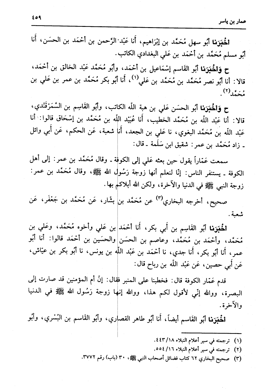 أخبرنا أبو سهل محمد بن إبراهيم أنا عبد الرحمن بن أحمد بن الحسن أنا أبو مسلم محمد بن أحمد بن علي البغدادي الكاتب ح وأخبرنا أبو القاسم إسماعيل بن أحمد وأبو محمد عبد الخالق بن أحمد قالا أنا أبو نصر محمد بن محمد بن علي (1) أنا أبو بكر محمد بن عمر بن علي بن محمد (2) ح وأخبرنا أبو الحسن علي بن هبة الله الكاتب وأبو القاسم بن السمرقندي قالا أنا عبد الله بن محمد الخطيب أنا عبيد الله بن محمد بن إسحاق قالوا أنا عبد الله بن محمد البغوي نا علي بن الجعد أنا شعبة عن الحكم عن أبي وائل زاد محمد بن عمر شقيق ابن سلمة قال سمعت عمارا يقول حين بعثه علي إلى الكوفة وقال محمد بن عمر إلى أهل الكوفة يستنفر الناس إنا لنعلم أنها زوجة رسول الله (صلى الله عليه وسلم) وقال محمد بن عمر زوجة النبي (صلى الله عليه وسلم) في الدنيا والآخرة ولكن الله أبلاكم بها صحيح أخرجه البخاري (3) عن محمد بن بشار عن محمد بن جعفر عن شعبة أخبرنا أبو القاسم بن أبي بكر أنا أحمد بن علي وأخوه محمد وعلي بن محمد وأحمد بن محمد وعاصم بن الحسن والحسين بن أحمد قالوا أنا أبو عمر أنا أبو بكر أنا جدي نا أحمد بن عبد الله بن يونس نا أبو بكر بن عياش عن أبي حصين عن عبد الله بن رباح قال قدم عمار الكوفة قال فخطبنا على المنبر فقال إن أم المؤمنين قد صارت إلى البصرة ووالله إني لأقول لكم هذا ووالله إنها زوجة رسول الله (صلى الله عليه وسلم) في الدنيا والآخرة أخبرنا أبو القاسم أيضا أنا أبو طاهر القصاري وأبو القاسم بن البسري وأبو